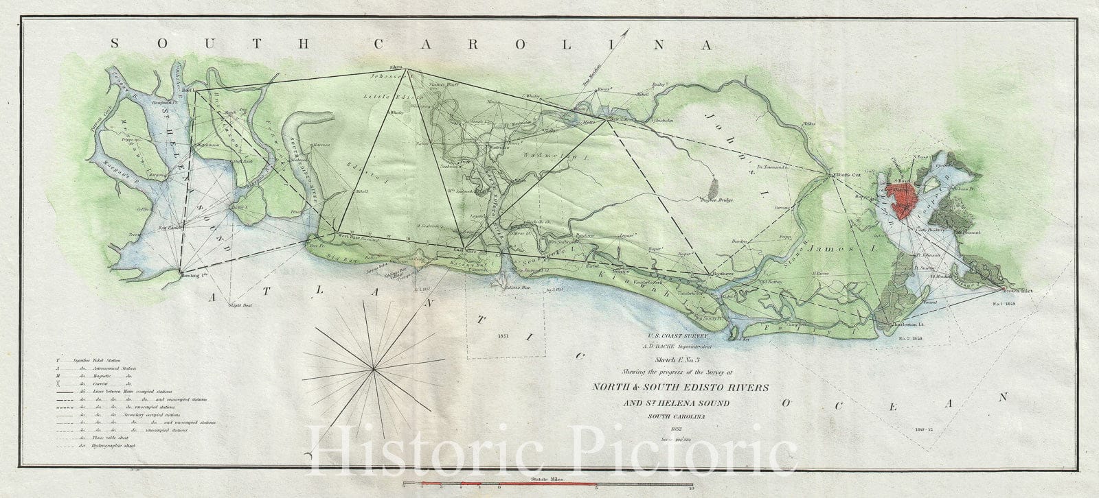 Historic Map : The North and South Edisto Rivers, South Carolina "Charleston", U.S. Coast Survey, 1852, Vintage Wall Art