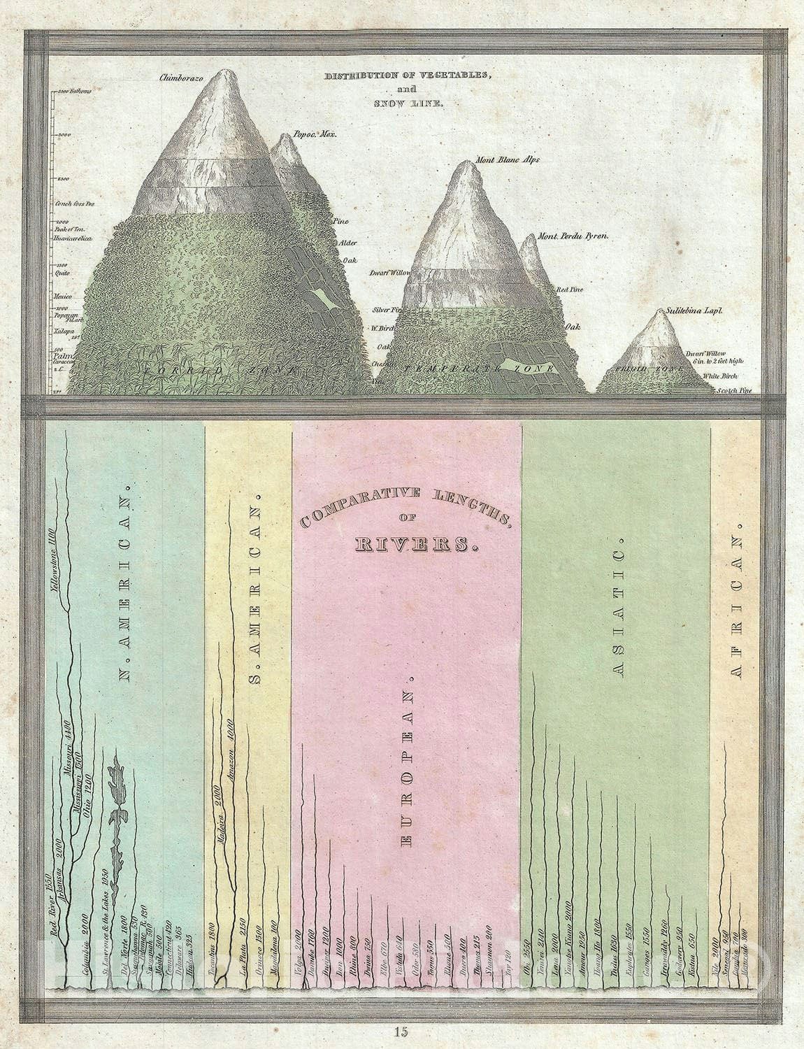 Historic Map : The Principle Rivers and Distribution of Vegetables and Snow Levels, BraArtd Comparative, 1835, Vintage Wall Art