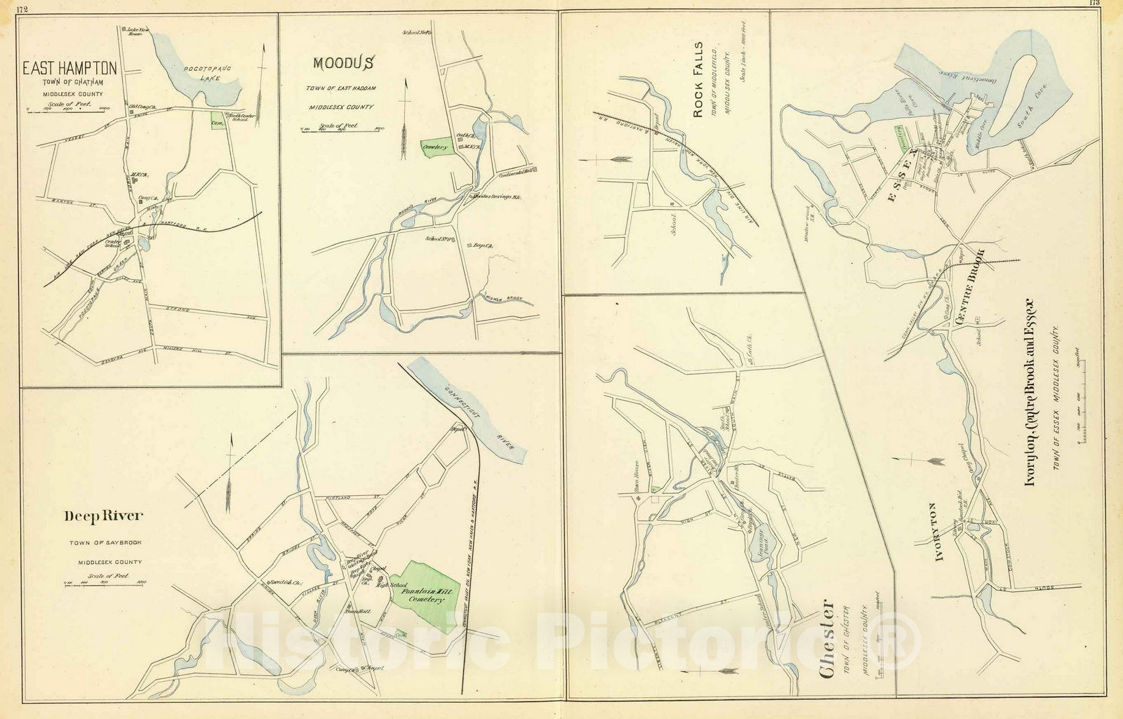Deep River, town of Saybrook, Middlesex County. Ivoryton, Centre Brook and Essex, town of Essex, Middlesex County. (with) East Hampton, town of Chatham ... (with) Moodus, town of East Haddam ... (with) Chester, town of Chester ... (with) Rock Falls, town of Middlefield ... (Copyright 1893 by D.H. Hurd & Co.) | Town and city atlas of the state of Connecticut. Compiled from government surveys, county records and personal investigations. D.H. Hurd & Co., Boston. 1893. Copyright 1893, by D.H. Hurd & Co., Boston. | See note field above.