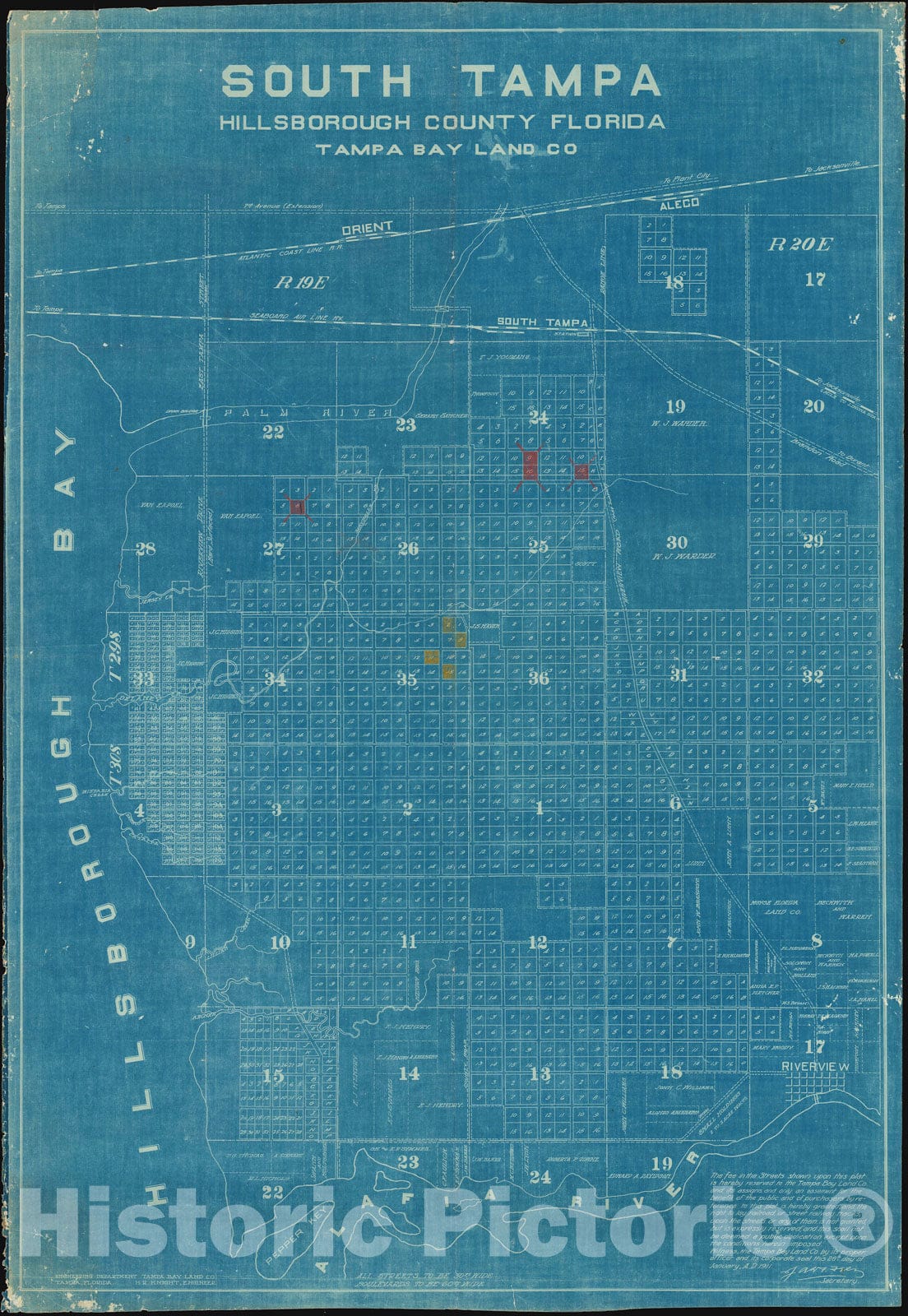 Historic Map : Tampa SE: Palm River-Clair Mel, Riverview, Tampa Land Co., 1911, Vintage Wall Art