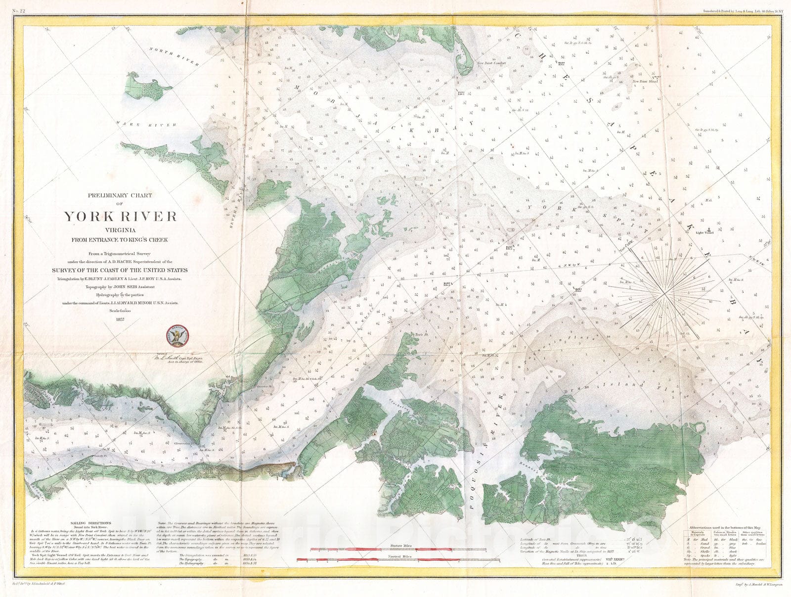 An attractive hand colored 1857 U.S. Coast Survey nautical chart or map of Virginia's York River. Covers the course of the York River from its entrance at the Chesapeake Bay to King Creek. Offers countless depth soundings, sailing instructions, and nav
