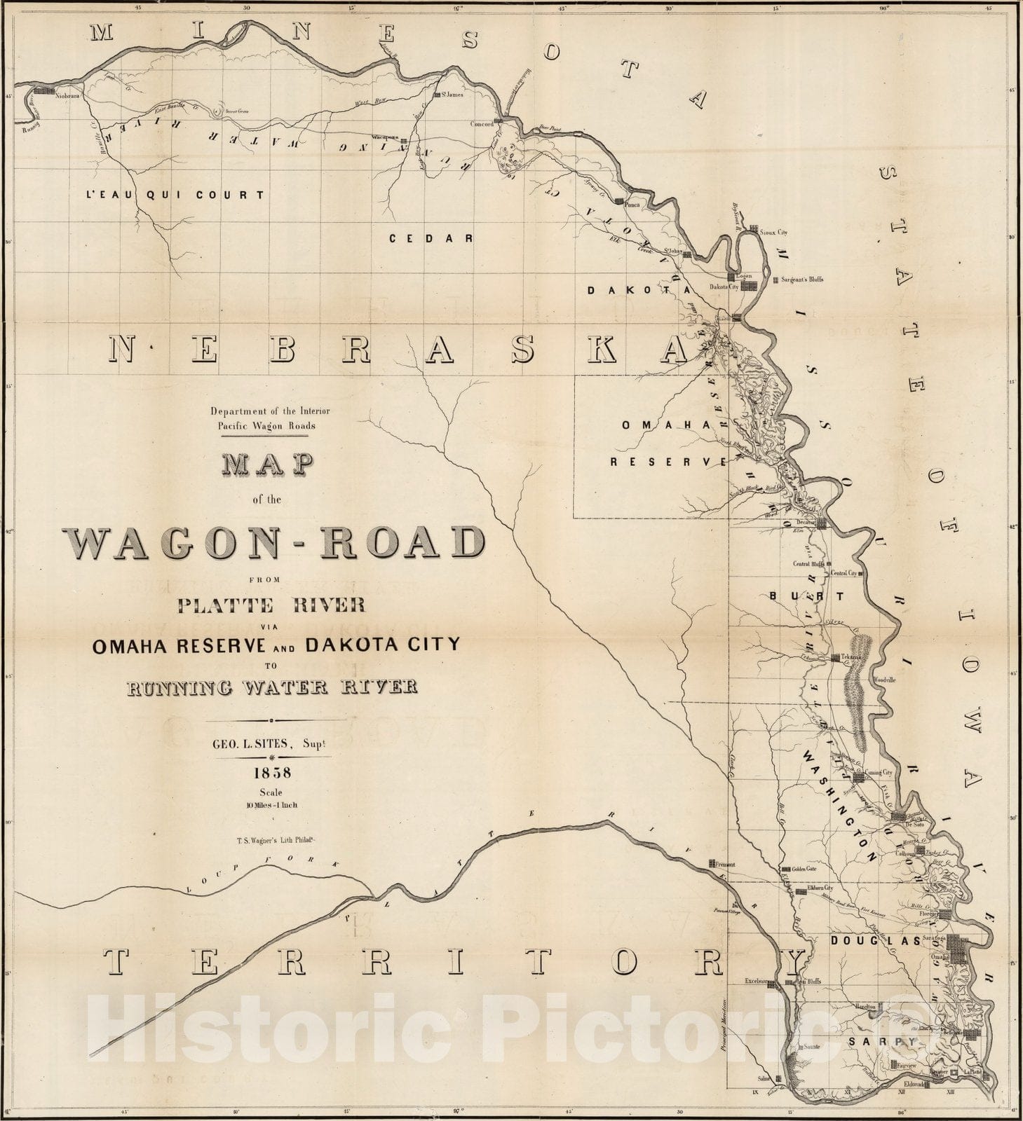Historic Map : Map of the Wagon-Road from Platte River via Omaha Reserve and Dakota City to Running Water River, 1858 - Vintage Wall Art
