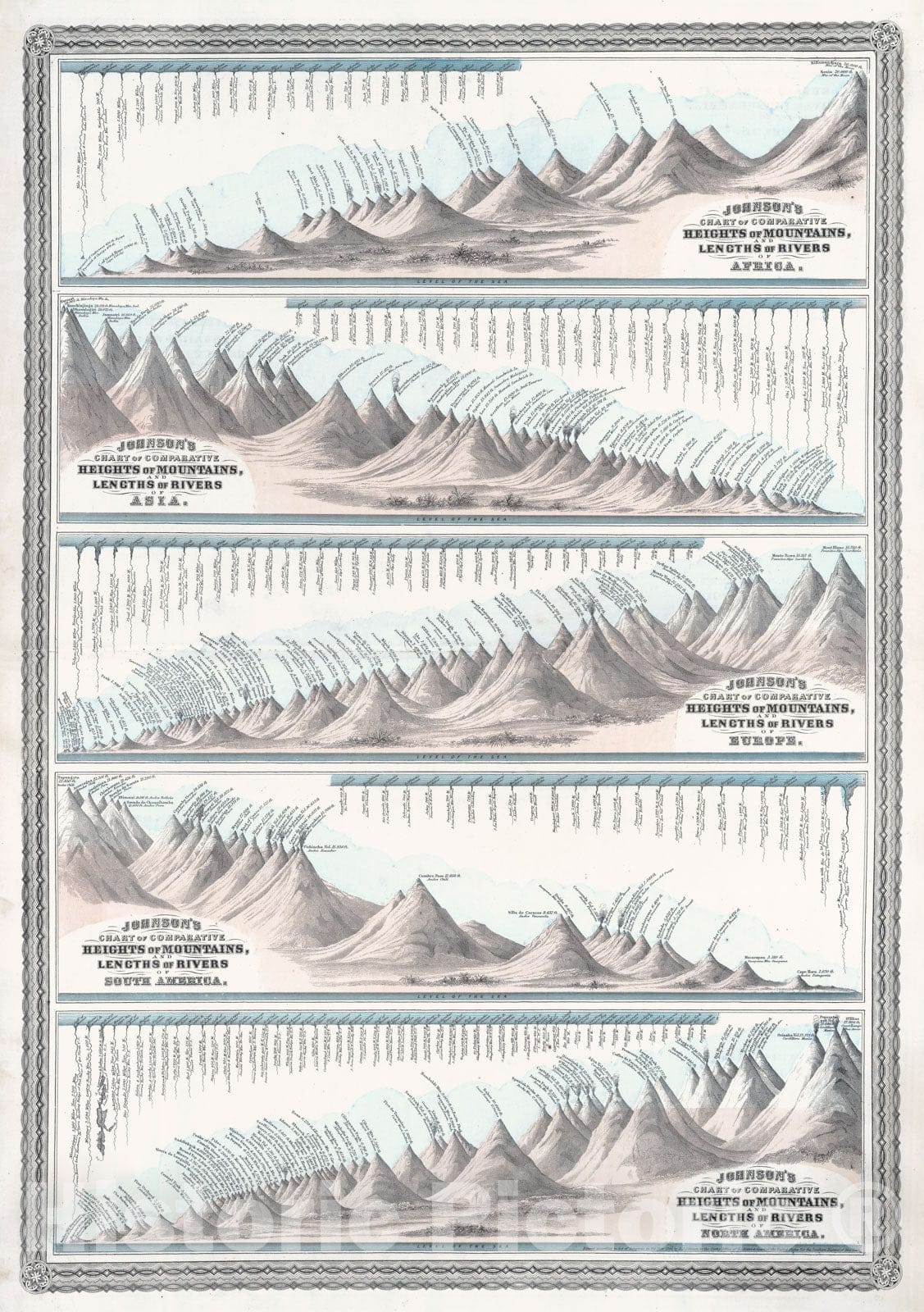 Historic Map - World Atlas - 1870 Johnson's Chart of Comparative Heights of Mountains, and Lengths of Rivers.
