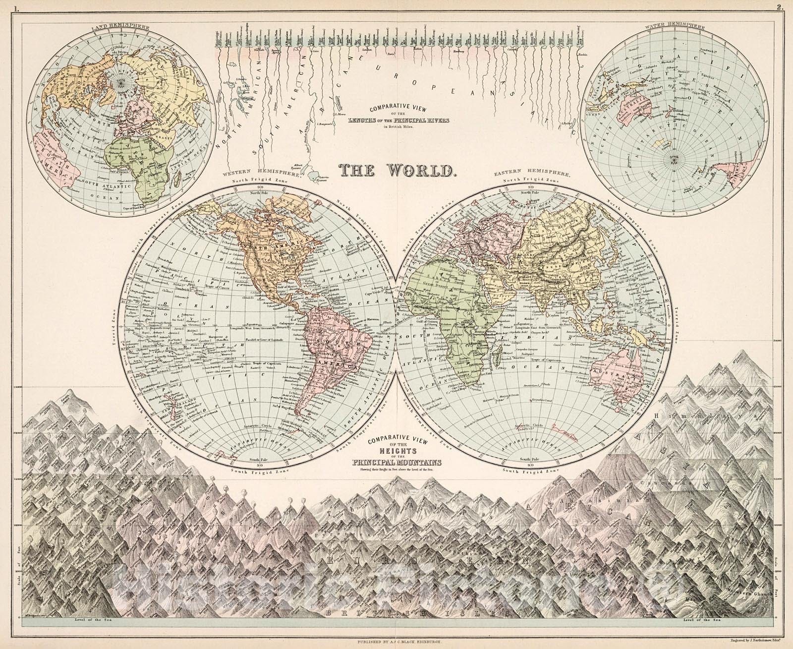 Historic Map : The World. Comparative View of the Lengths of the Principal Rivers and Heights of the Principal Mountains., 1884, Vintage Wall Decor