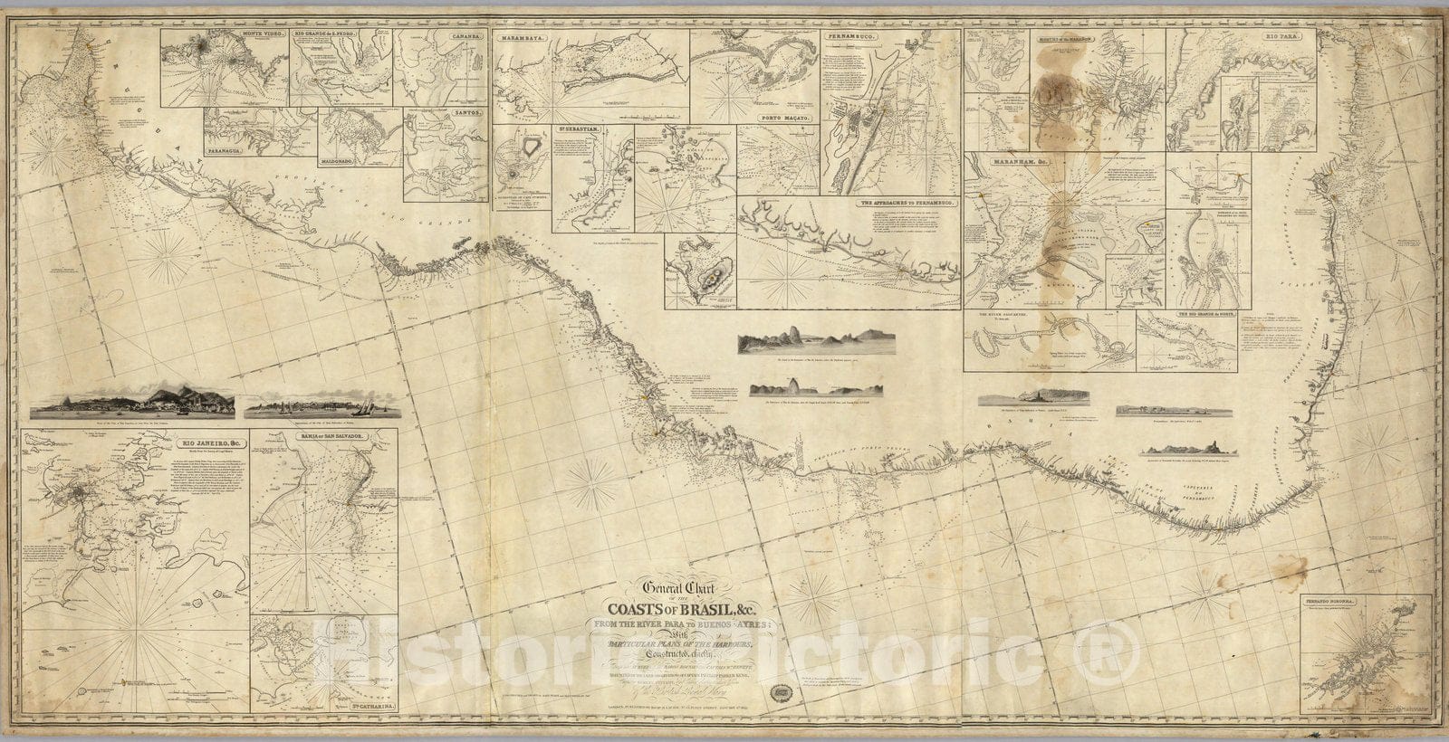 General chart of the coasts of Brasil, &c. from the River Para to Buenos-Ayres; with particular plans of the harbours. Constructed chiefly From the surveys of the Baron Roussin and Captain Wm. Hewett, adjusted by the later observations of Captain Phillip Parker King, Captain Robert Fitzroy, and other distinguished Officers of the British Royal Navy. Constructed and drawn by John Purdy and Alexr. Findlay. Junr. London. Published By Richd. H. Laurie, No. 53, Fleet Street. January 1st 1853. (With 31 inset maps listed below) | General chart of the coasts of Brasil, &c. from the River Para to Buenos-Ayres; with particular plans of the harbours. Constructed chiefly From the surveys of the Baron Roussin and Captain Wm. Hewett, adjusted by the later observations of Captain Phillip Parker King, Captain Robert Fitzroy, and other distinguished Officers of the British Royal Navy. Constructed and drawn by John Purdy and Alexr. Findlay. Junr. London. Published By Richd. H. Laurie, No. 53, Fleet Street. January 1st 1853. (with 31 inset maps listed in note field above) | See note field above.