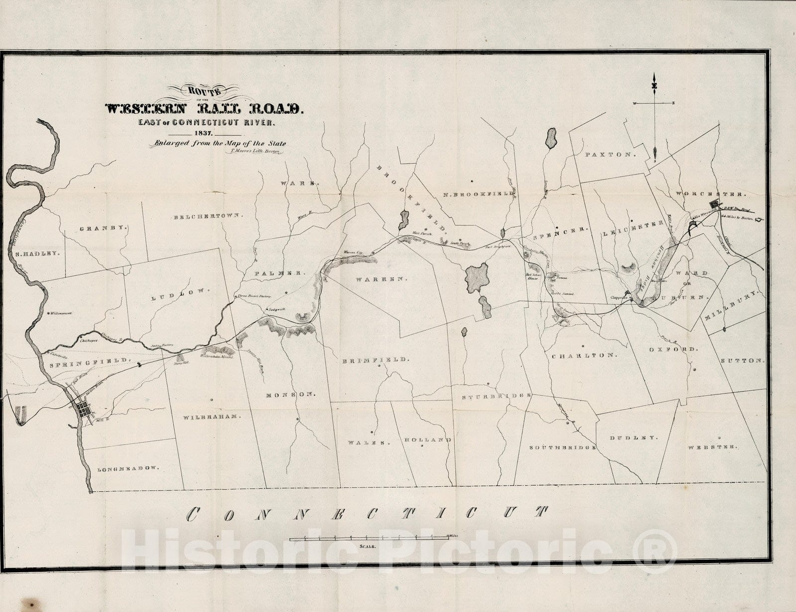 Route of the Western railroad. East of Connecticut River. 1837. Enlarged from map of the state. T. Moore's Lith. Boston. (to accompany) Reports of The Engineers of the Western Railroad Corporation. | Reports of The Engineers of the Western Railroad Corporation, Made to the Directors, in 1836-7. Springfield: Printed by Merriam, Wood and Co. 1838. |