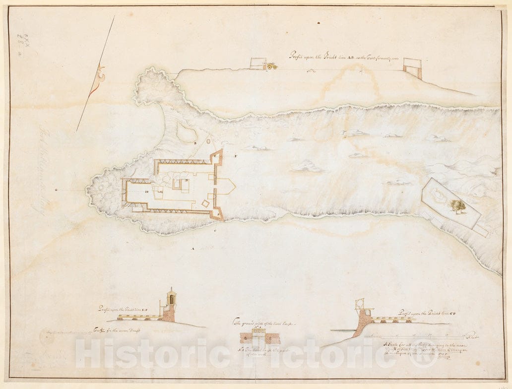 Plan of Fort William and Mary on the Island of New Castle surrounded by Piscataqua River, with a view in profile of the Fort as it formerly was showing a cannon and a piece of wall above, and two sections of the bastions and a detail of the watch-house below; scale and explanatory text, within washline.||Titled ‘A drawn Plan of Her Majesty's Fort William and Mary, on Piscataqua River, America, 1705; with a Profile of ditto†in the Catalogue of the Maps, Prints, Drawings, etc., forming the geographical and topographical collection attached to the Library of his late Majesty King George the third, etc., London, 1829.||Titled 'A colored plan of "Her Majesty's Fort William and Mary, on Piscataqua River, America, 1705;" drawn on a scale of 55 feet to an inch; with profils on a scale of 13 feet to an inch' in the Catalogue of the manuscript maps, charts, and plans, and of the topographical drawings in the British Museum, London, 1844-1861.
