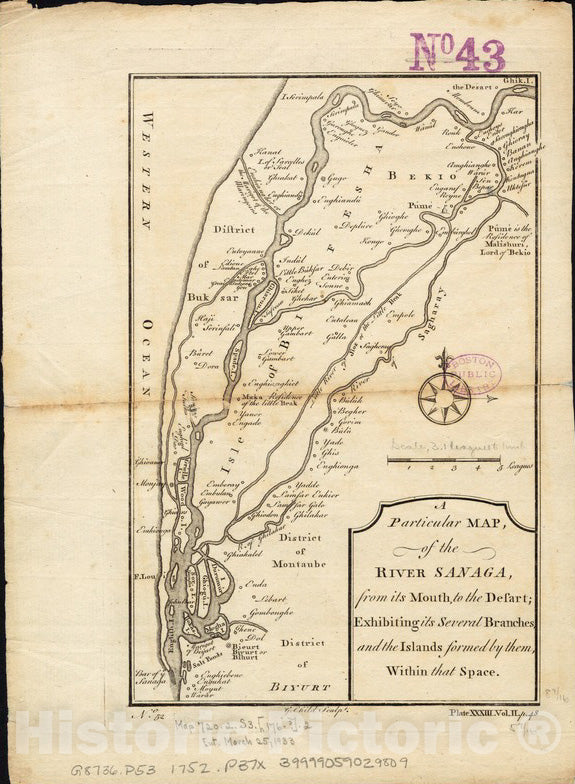 Historical Map, 1752 A particular map of the River Sanaga, from its mouth, to the desart, exhibiting its several branches, and the islands formed by them, within that space, Antique Vintage Wall Art