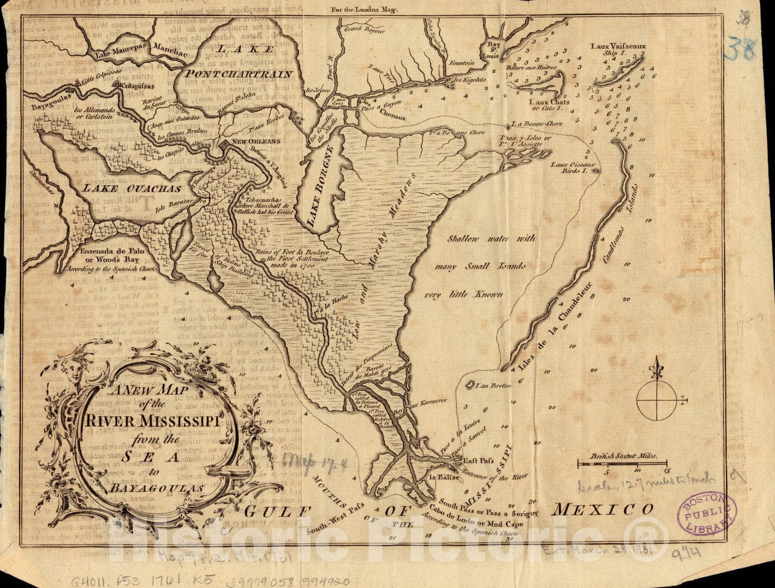 Historical Map, 1761 A New map of The River Mississipi from The sea to Bayagoulas, Vintage Wall Art