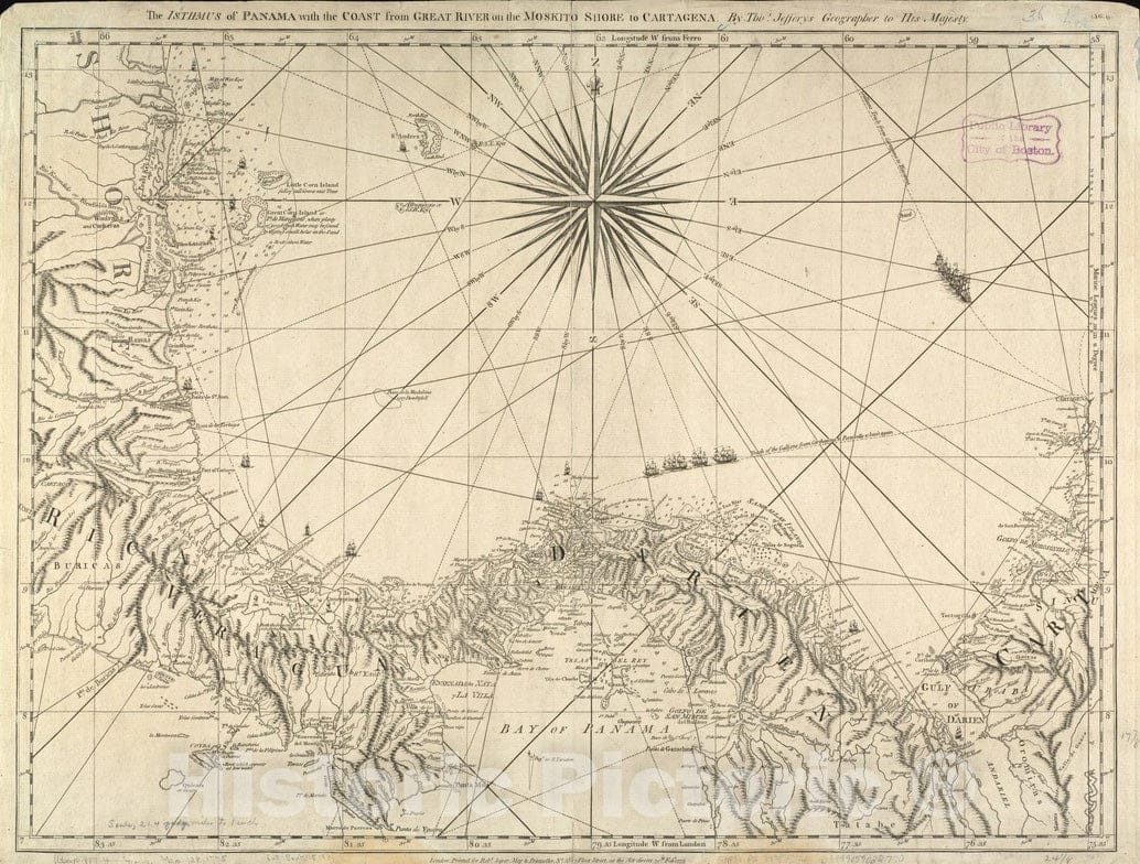 Historical Map, 1775 The Isthmus of Panama with the coast from Great River on the Moskito shore to Cartagena, Vintage Wall Art