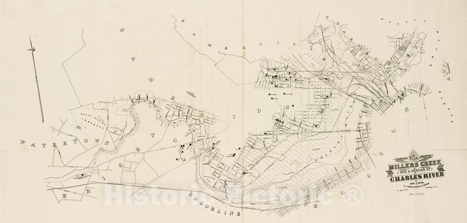 Historical Map, 1873 Compiled Plan, Showing Millers Creek and a Portion of Charles River, Vintage Wall Art