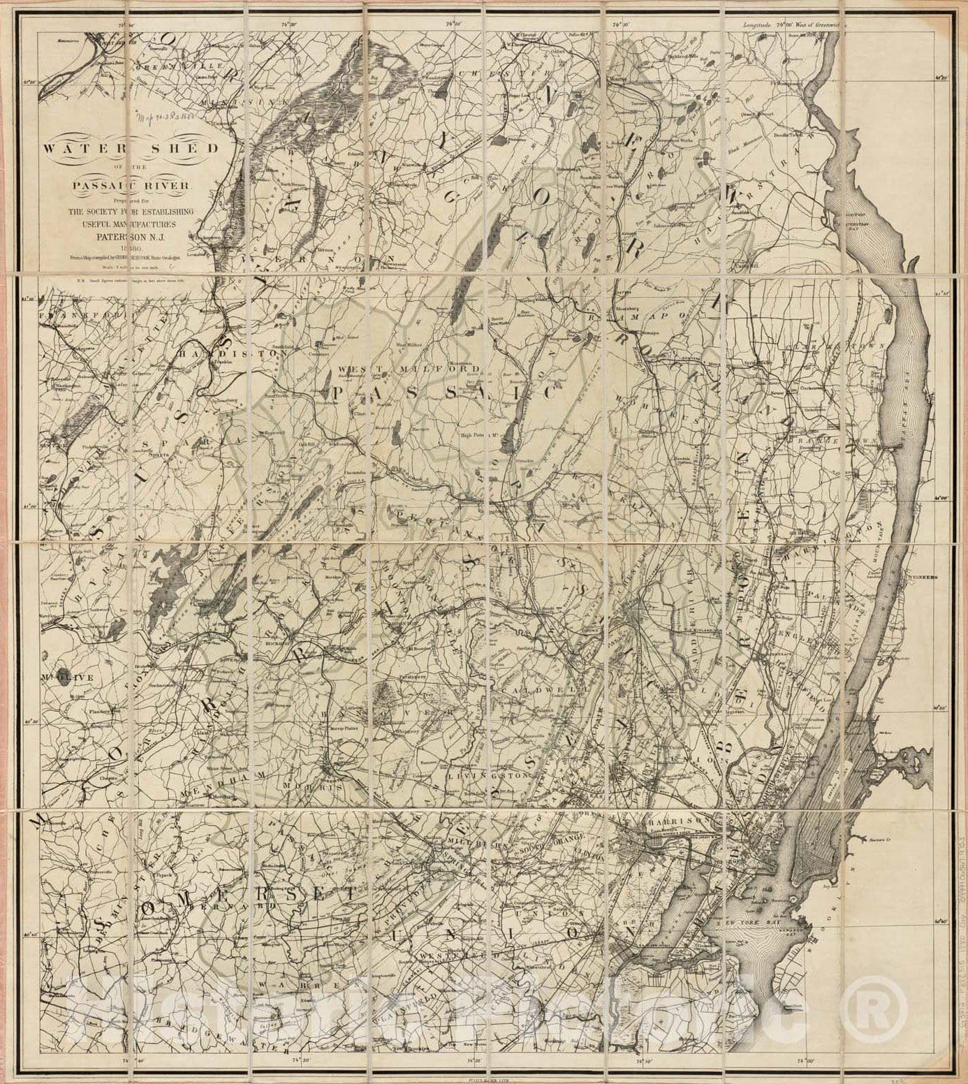 Historical Map, 1880 Water shed of The Passaic River, Vintage Wall Art