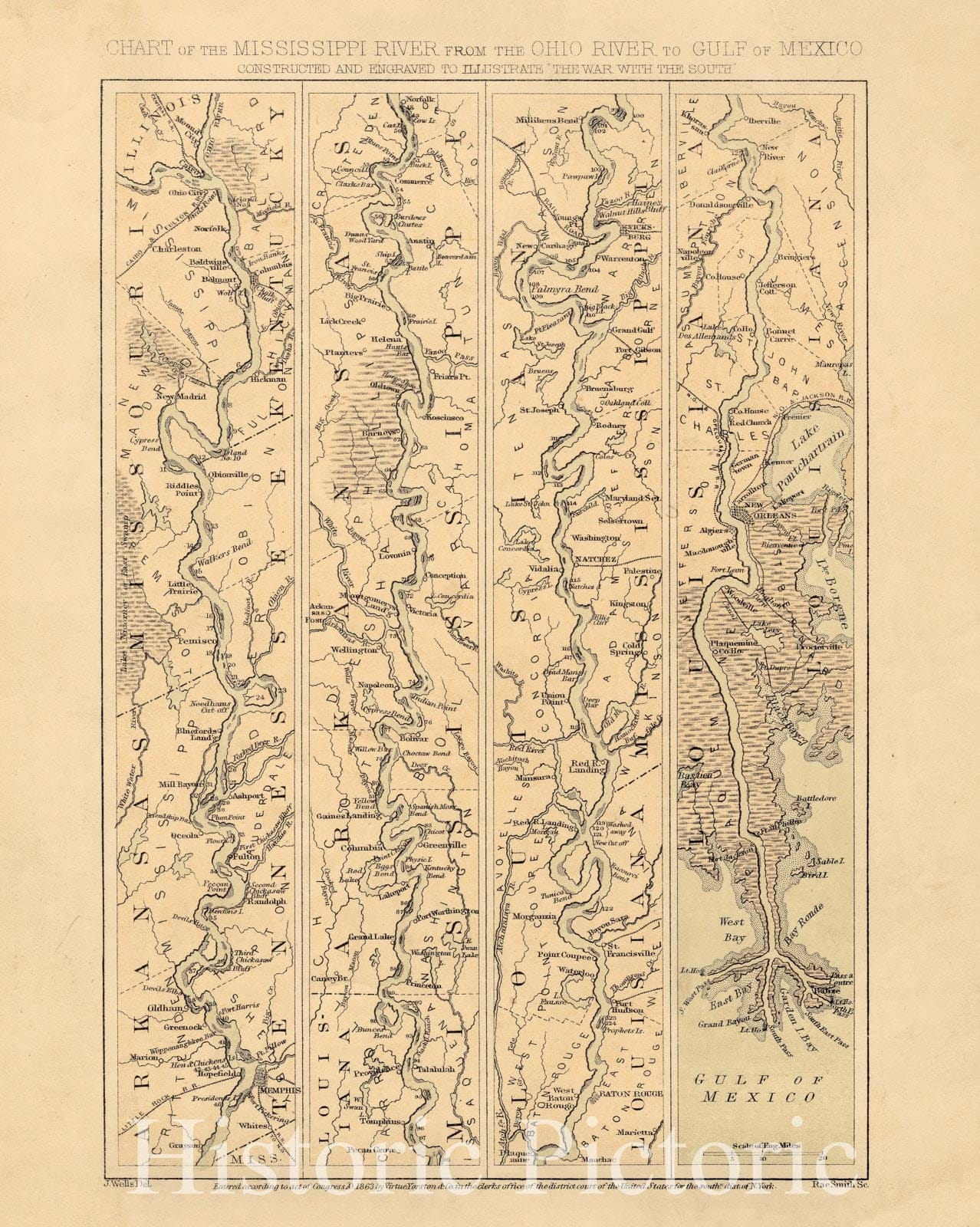 Historical Map, c.1863 Chart of The Mississippi River from The Ohio River to Gulf of Mexico : Constructed and Engraved to illustrate 'The War with The South', Vintage Wall Art