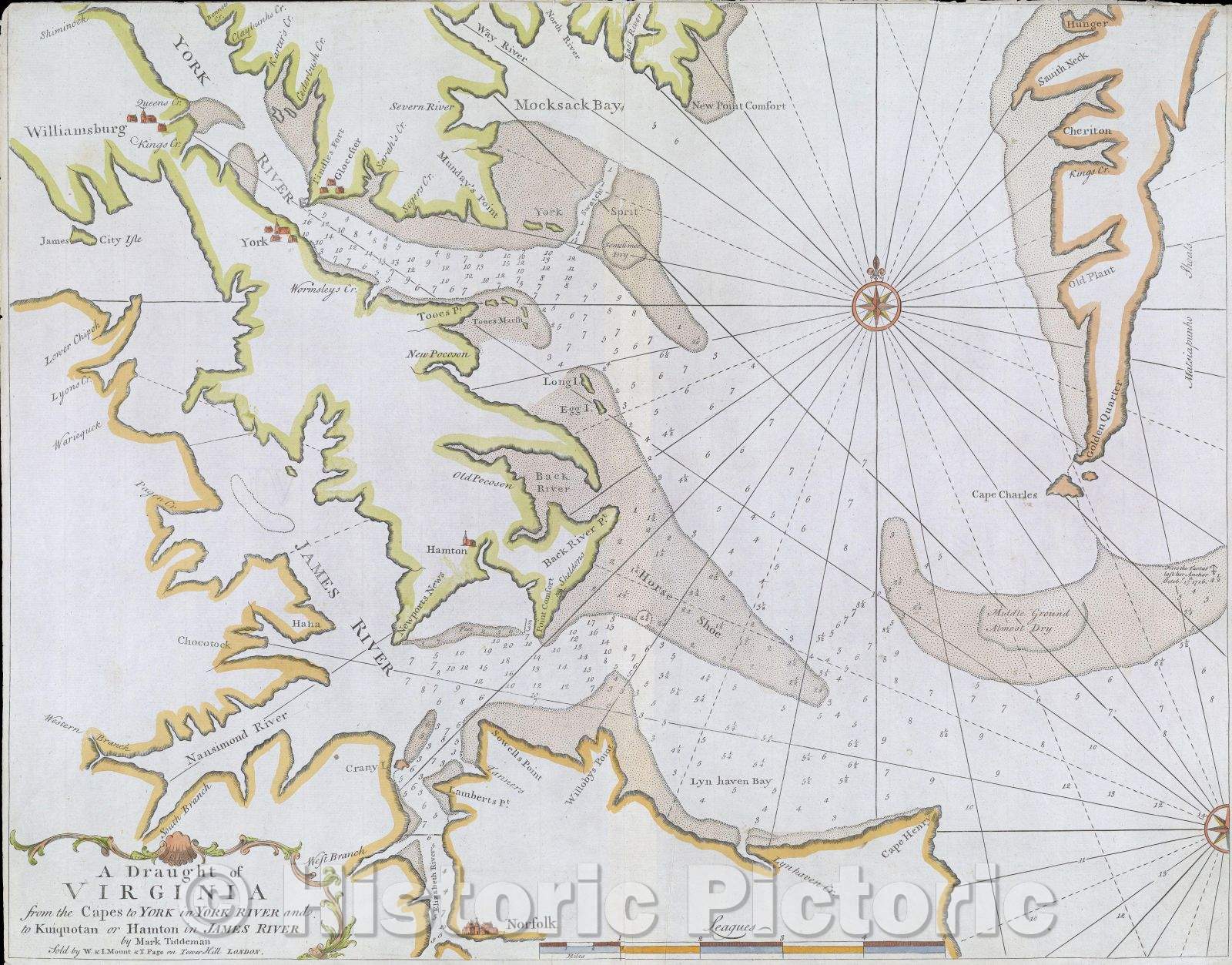 Historic Map : A Draught of Virginia from the Capes the York in York River and to Kuinquotan or Hamton in James River by Mark Tiddeman, 1755 , Vintage Wall Art