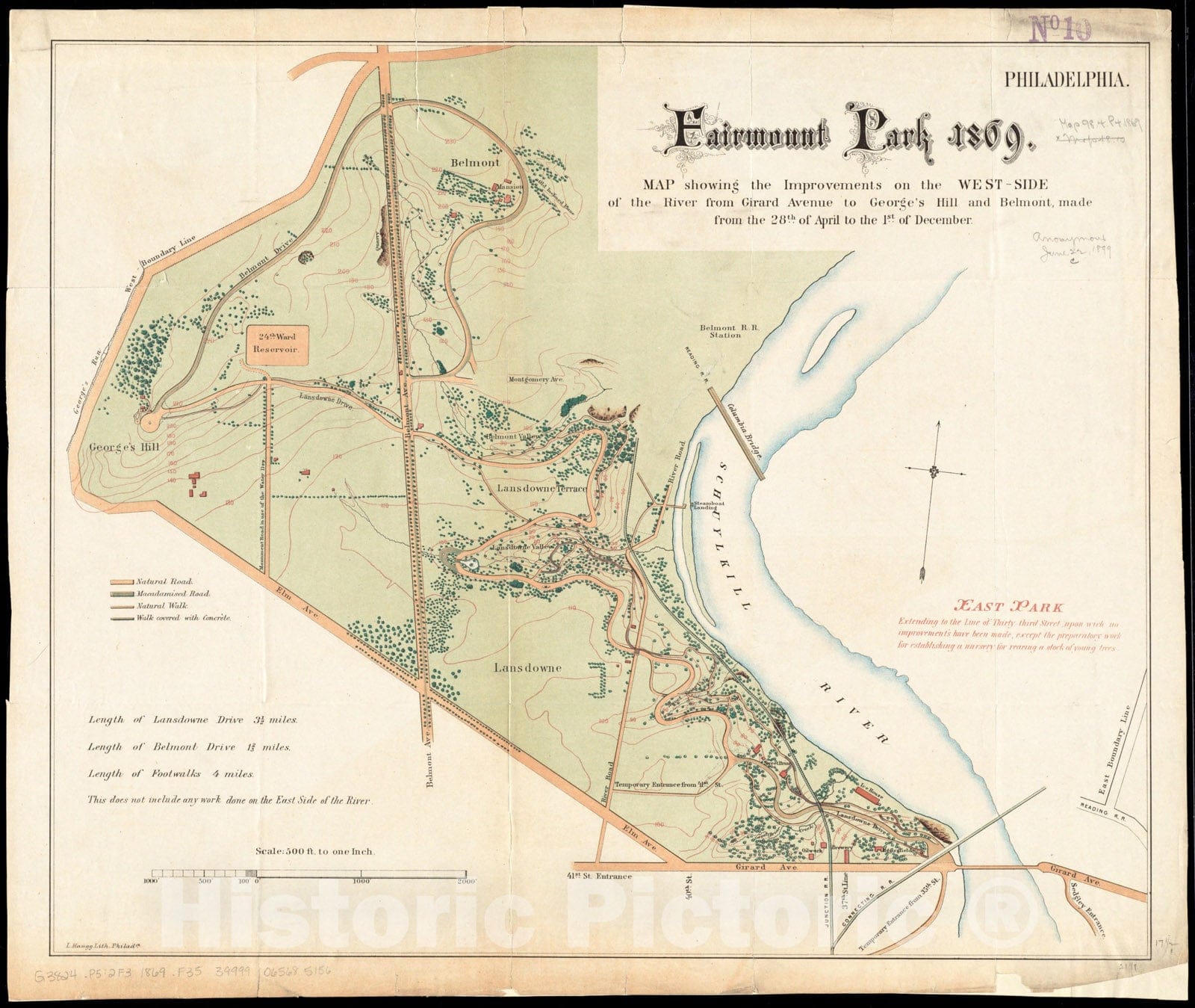 Historical Map, Fairmount Park 1869 : map Showing The improvements on The west-Side of The River from Girard Avenue to George's Hill and Belmont, Made from The 28th, Vintage Wall Art