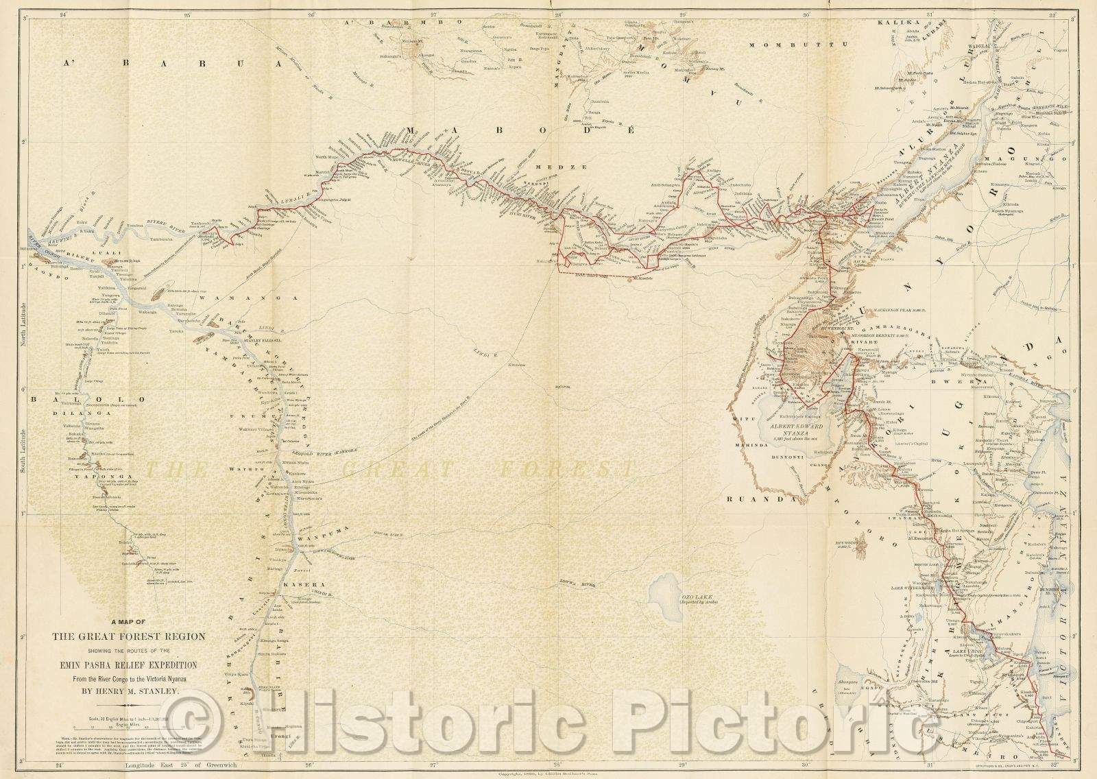 Historic Map : A Map of the Great Forest Region showing the routes of the Emin Pasha Relief Expedition from the River Congo to Victoria Nyanza., 1890 , Vintage Wall Art