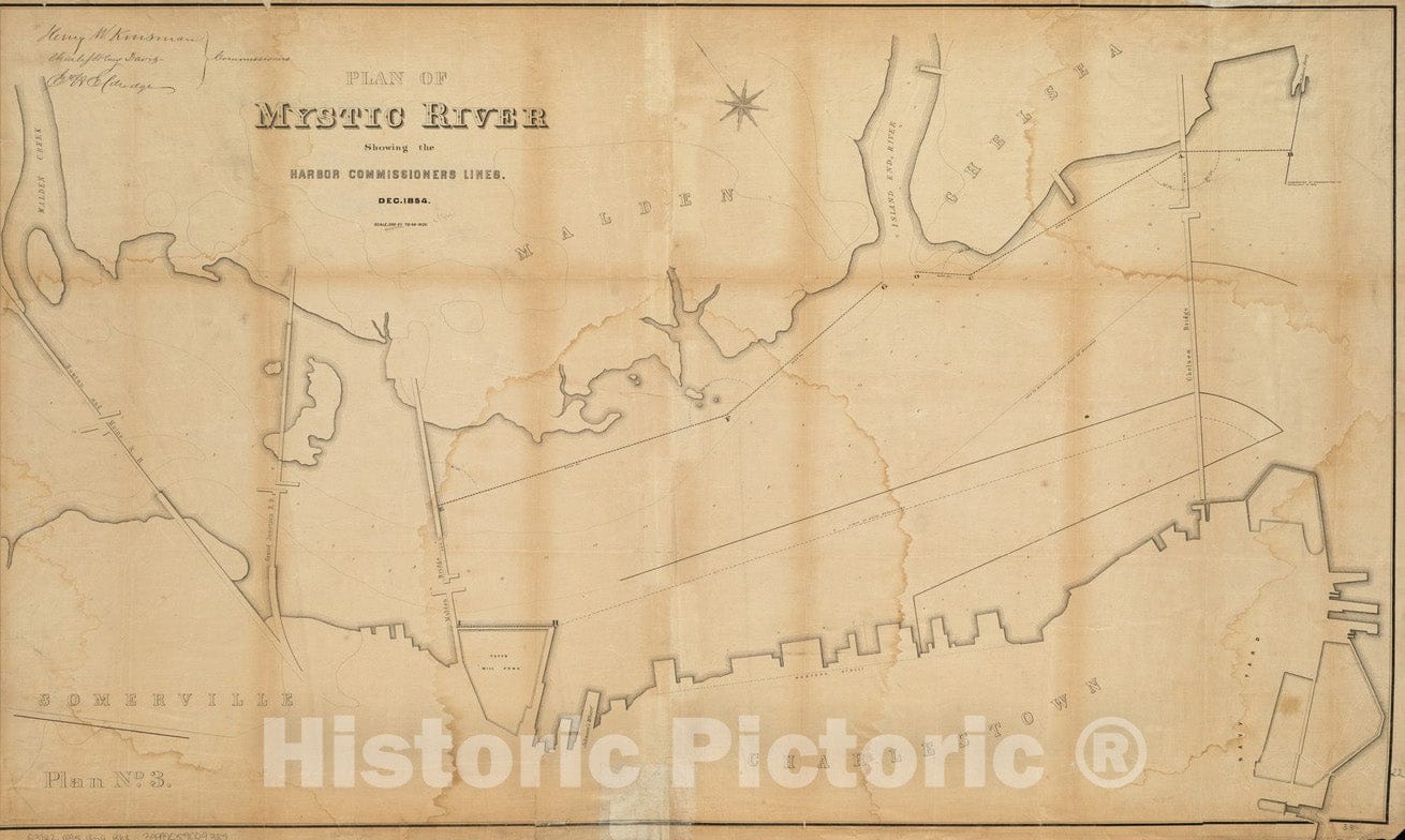 Historical Map, Plan of Mystic River Showing The Harbor Commissioners Lines : Dec. 1854, Vintage Wall Art