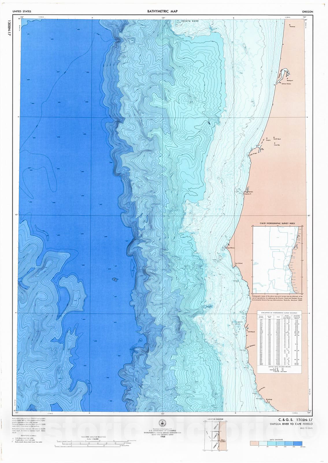 Historic Nautical Map - Umpqua River - Cape Ferrelo, 1968 NOAA Bathymetric Historic Nautical Map - Oregon (OR) - Vintage Wall Art