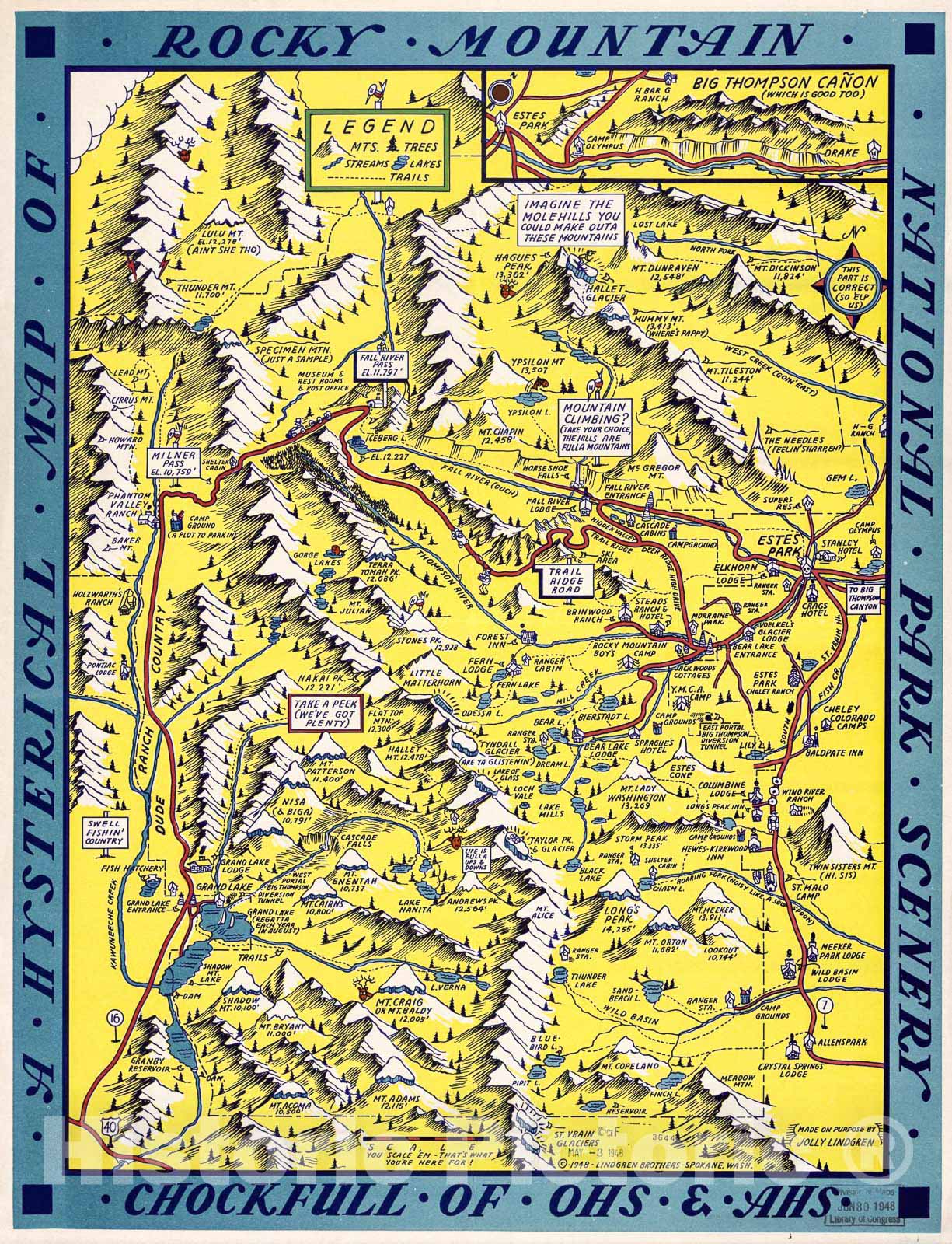 • .Historic 1948 Map - A Hysterical map of Rocky Mountain National Park Scenery : chockfull of OHS & AHS