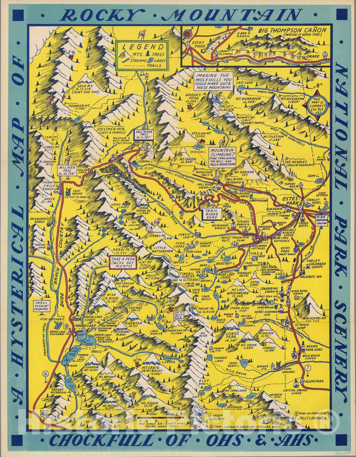 Historic Map : Hysterical Map of Rocky Mountain National Park Scenery, Chockfull of Ohs & Ahs, 1948 - Vintage Wall Art