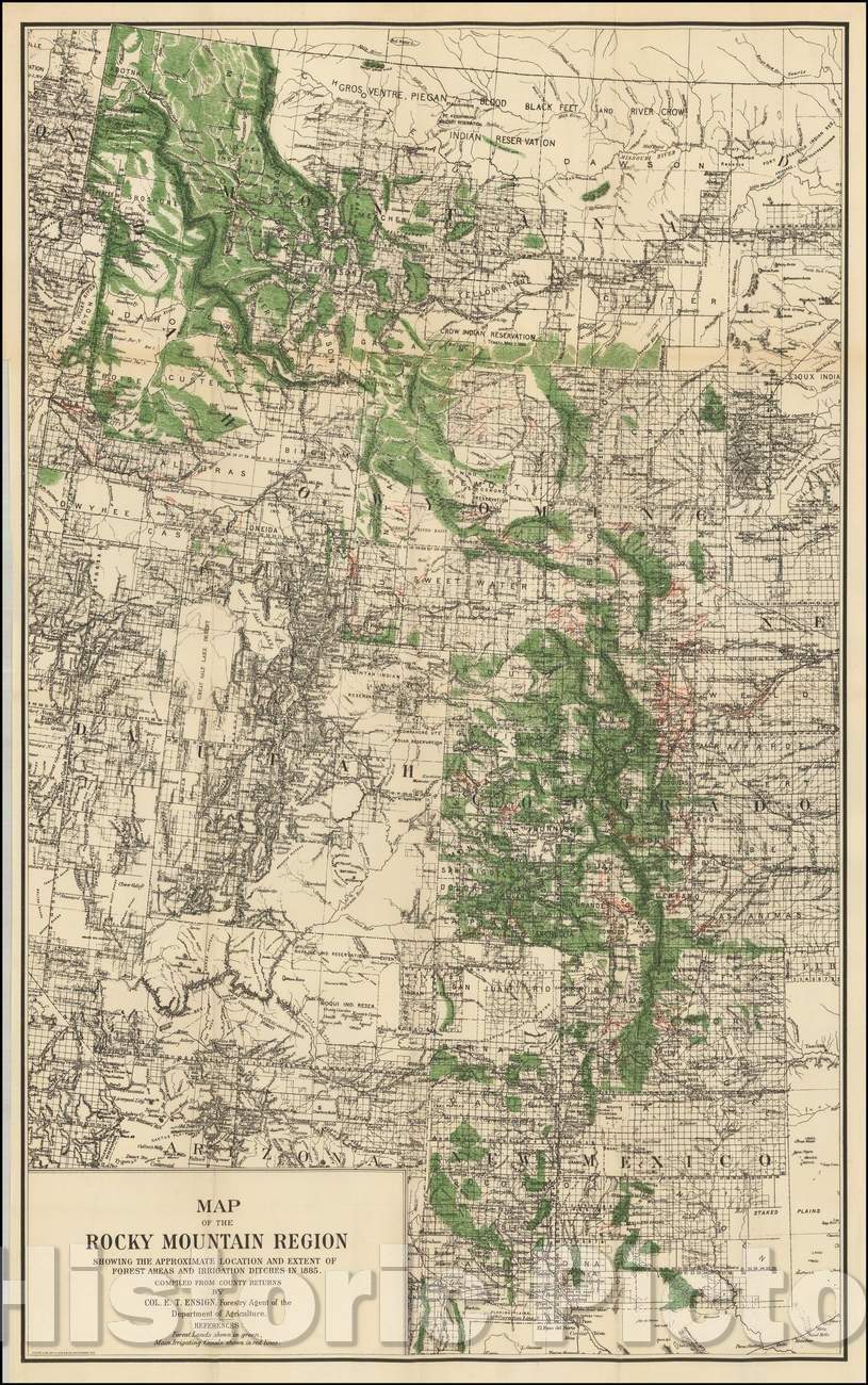 Historic Map - Map of the Rocky Mountain Region Showing The Approximate Location And Extent of Forest Areas And Irrigation Ditches In, 1885, Hoen & Co. v4