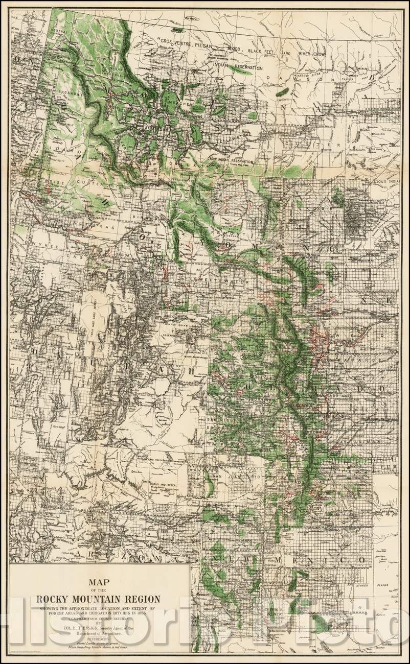 Historic Map - Map of the Rocky Mountain Region Showing The Approximate Location And Extent of Forest Areas And Irrigation Ditches In, 1885, Hoen & Co. v2