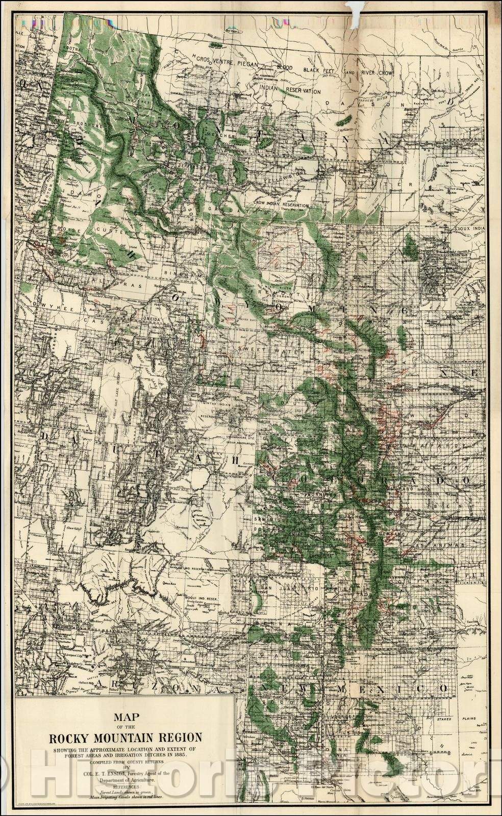 • .Historic Map - Map of the Rocky Mountain Region Showing The Approximate Location And Extent of Forest Areas And Irrigation Ditches In, 1885, Hoen & Co. v1