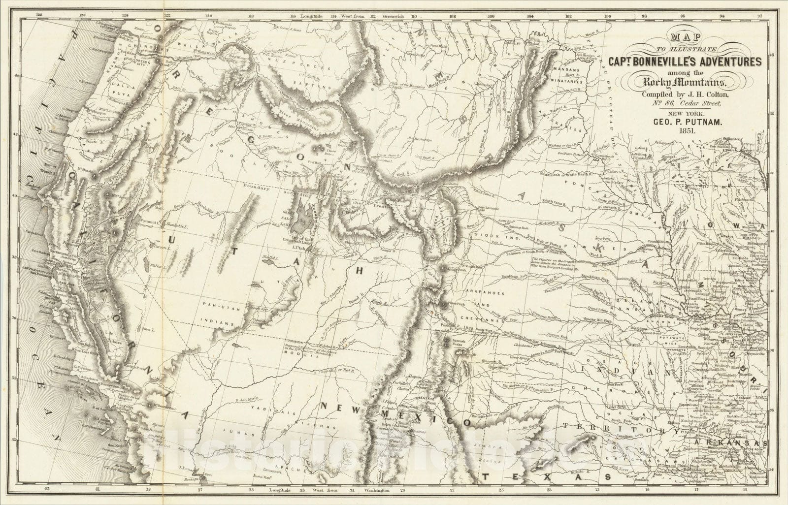Historic Map : Map To Illustrate Capt. Bonneville's Adventures among the Rocky Mountains, 1851, 1851, Joseph Hutchins Colton, Vintage Wall Art