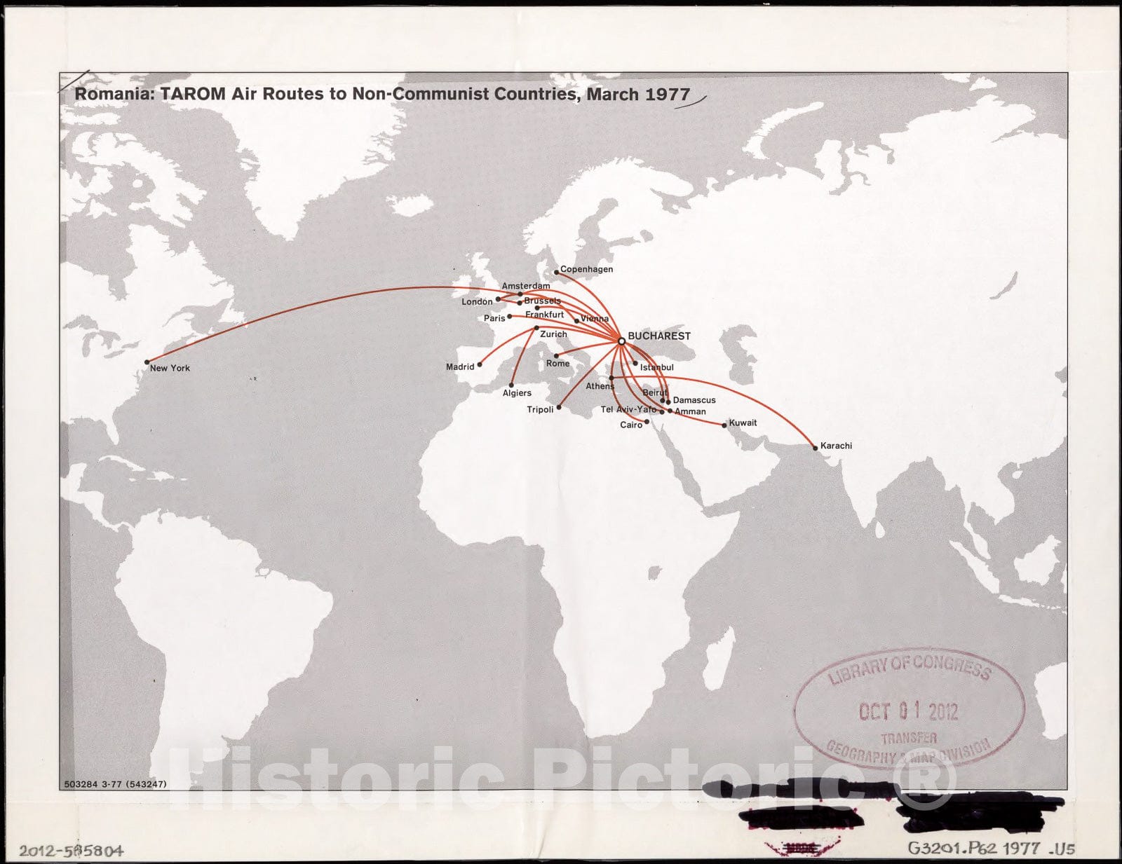 Historic 1977 Map - Romania-TAROM air Routes to Non-Communist Countries : March 1977 : The World