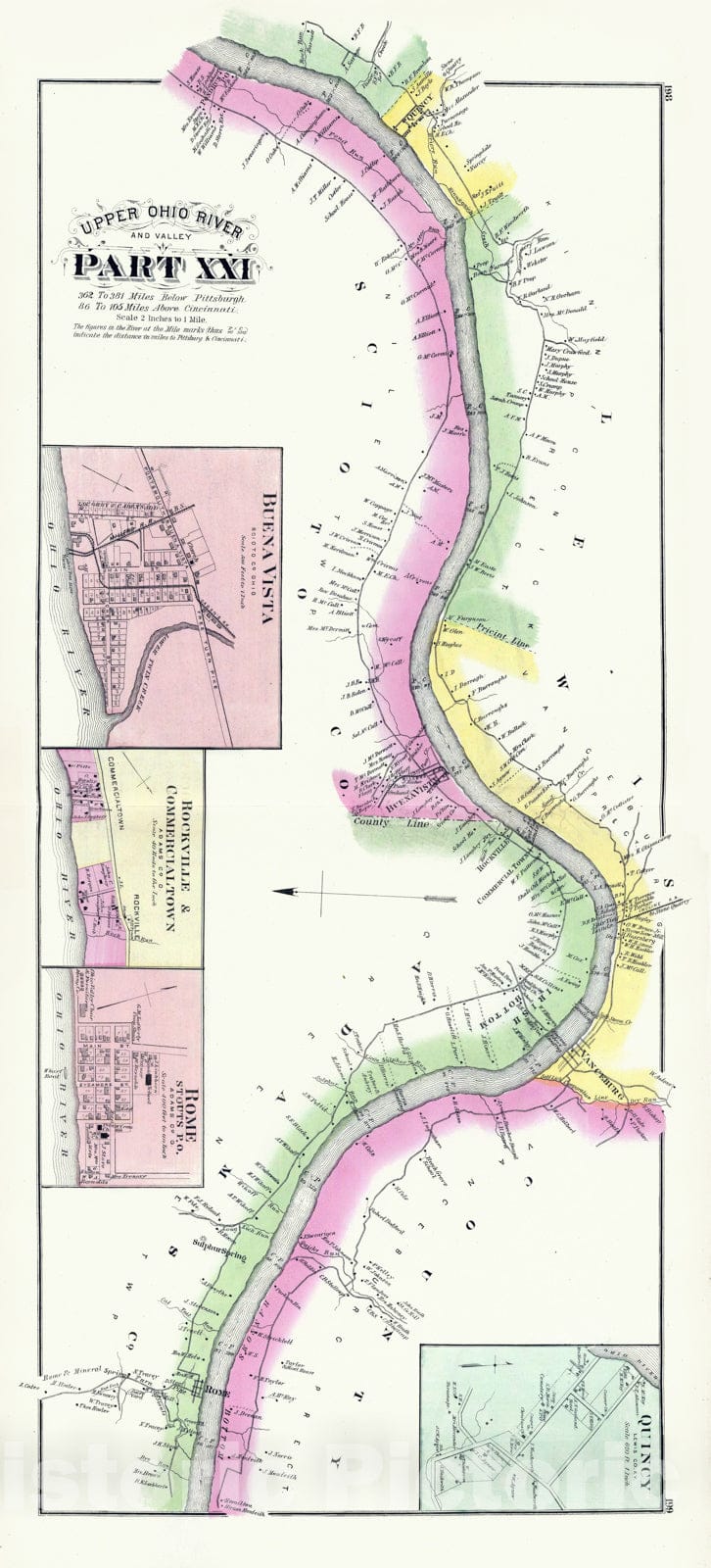 Historic Map - 1877 Upper Ohio River and Valley part XXI, 362 to 381 miles below Pittsburgh, Buena Vista, Rockville & Commercialtown, Rome, Ohio. - Vintage Wall Art