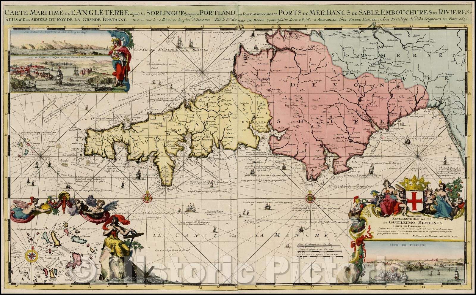 Historic Map - Carte Maritime de L'Angleterre depuis Sorlingues jusques a Portland ou l'on voit les costes et Ports, 1693, Romeyn De Hooghe v1