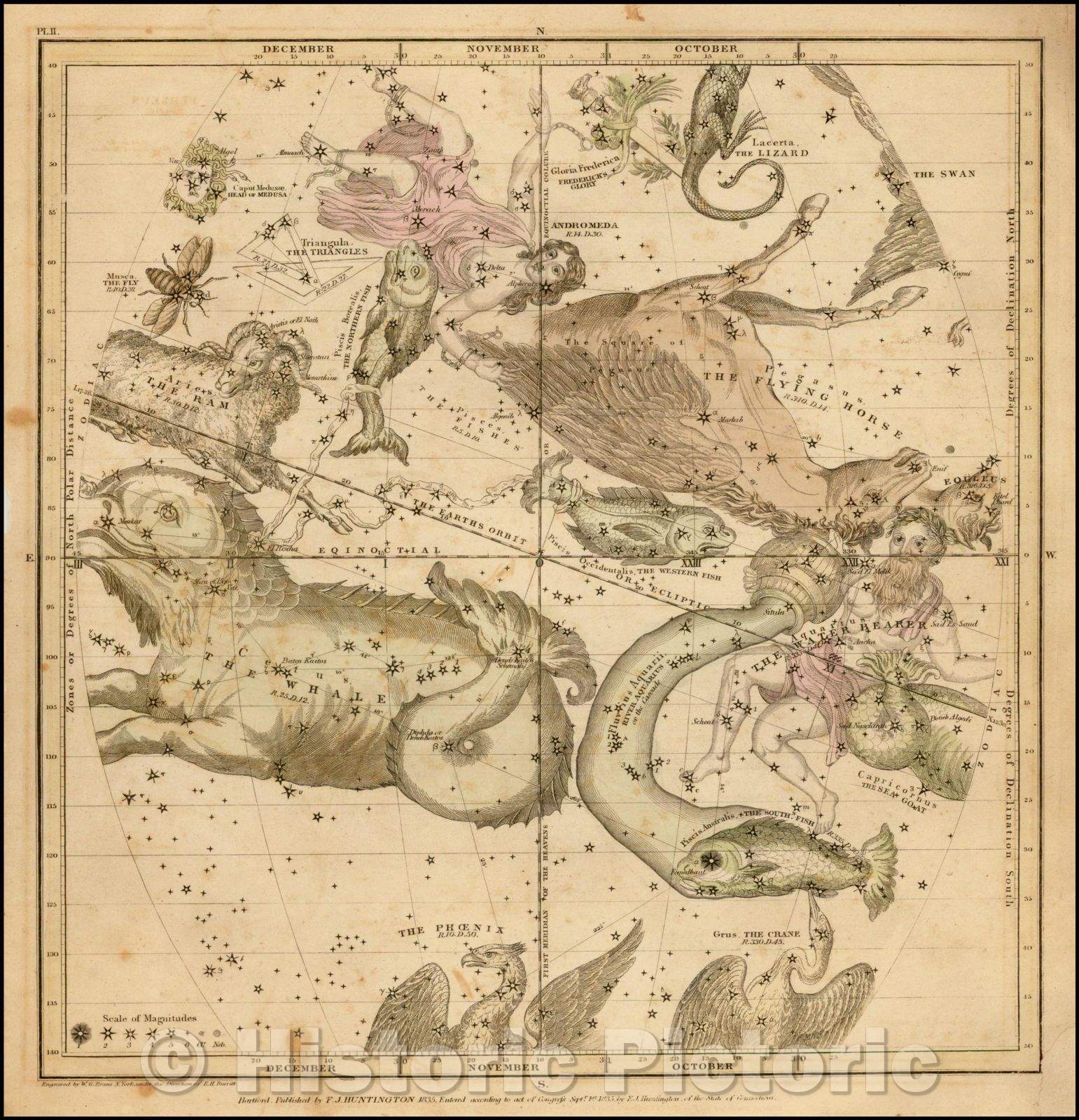 • .Historic Map - The October, November, and December Sky - Aquarius, Andromeda, Pisces, Pegasus, Aries, Phoenix, Grus, Lacerta, Triangle, etc, 1835 - Vintage Wall Art