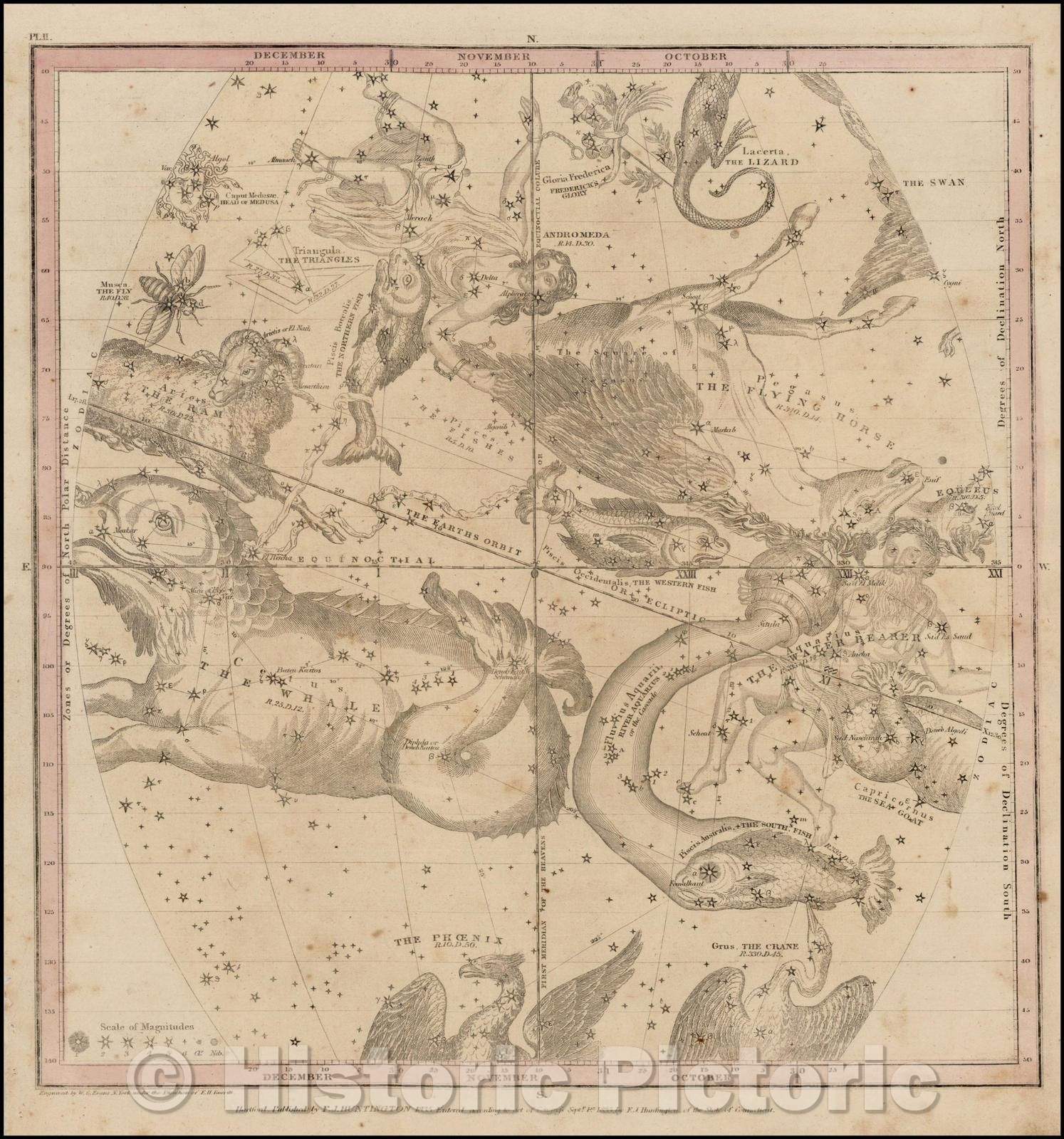 Historic Map - The October, November, and December Sky - Aquarius, Andromeda, Pisces, Pegasus, Aries, Phoenix, Grus,Lacerta, Triangle, etc, 1835 - Vintage Wall Art