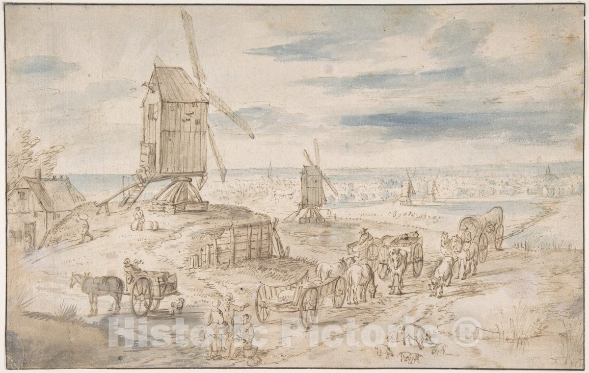 Dutch Landscape with Windmills - Netherlandish, Brussels 1568-1625 Antwerp-Netherlandish, Brussels 1568-1625 Antwerp - Artist Nationality: Netherlandish-Netherlandish - Original Medium, Materials or Technique: Pen and brown ink, brush and brown, blue, and gray wash; framing lines in black ink