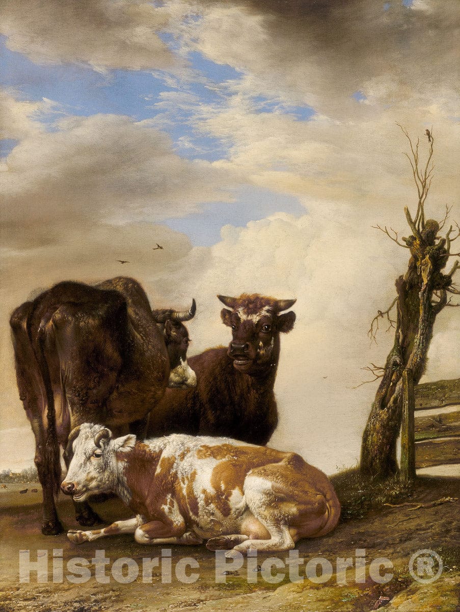 Art Print : Two Cows and a Young Bull beside a Fence in a Meadow, Paulus Potter, c 1974, Vintage Wall Decor :