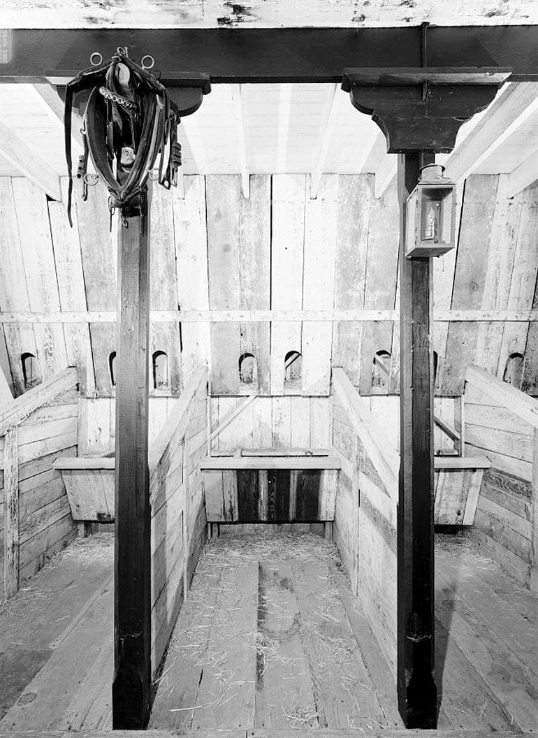 Elevation view of stall with drop feeders. - Livery-Plaza Stable, San Juan Bautista, San Benito County, CA