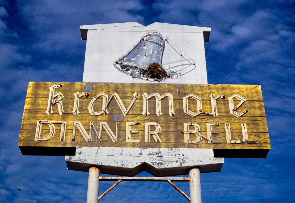 • .Historic Photo : 1982 Kravmore Dinner Bell Restaurant sign, Route 36, Belleville, Kansas | Margolies | Roadside America Collection | Vintage Wall Art :