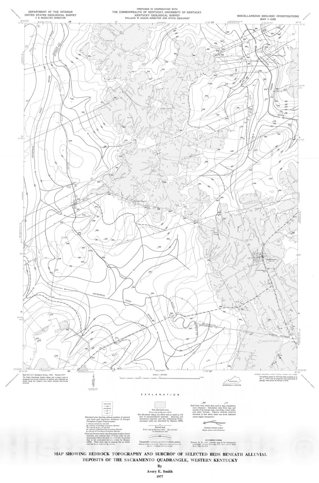 Map : Map showing bedrock topography and subcrop of selected beds beneath alluvial deposits of the Sacramento quadrangle, western Kentucky, 1977 Cartography Wall Art :