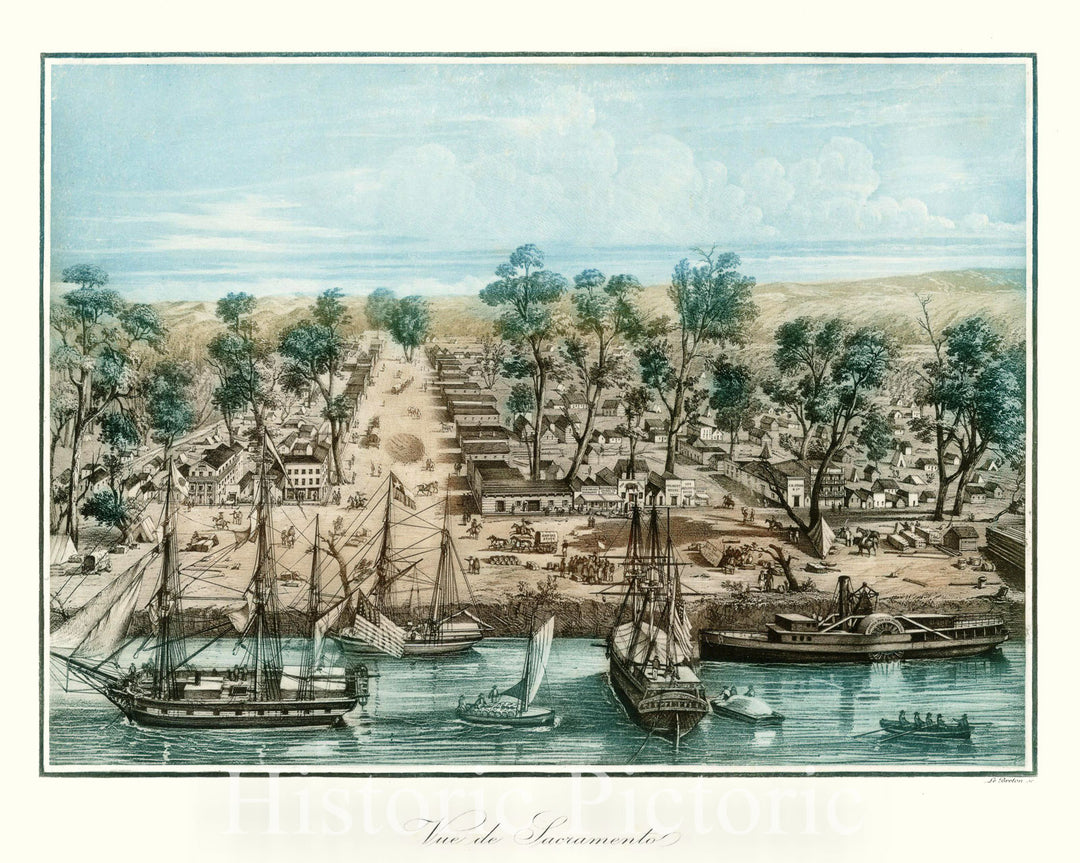 Historic Map - Vue de Sacramento/waterfront View of this booming Gold Rush town, looking from the Sacramento River, looking down J Street, Le Breton - Vintage Wall Art