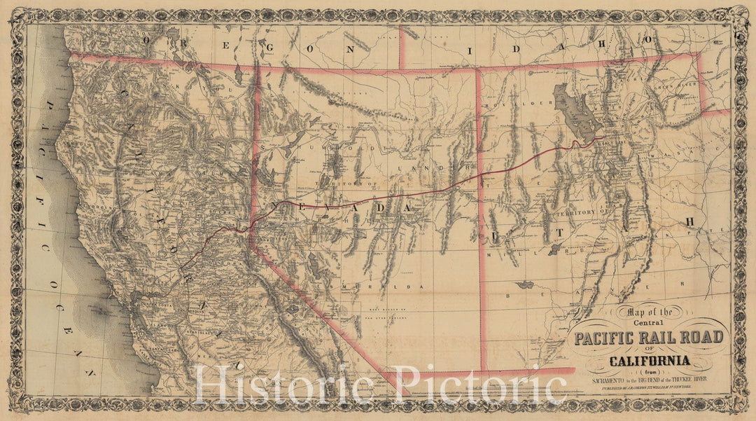 Historic Map - Map of the Central Pacific Rail Road of California (from) Sacramento to the Big Bend of the Truckee River, 1865, Joseph Hutchins Colton - Vintage Wall Art