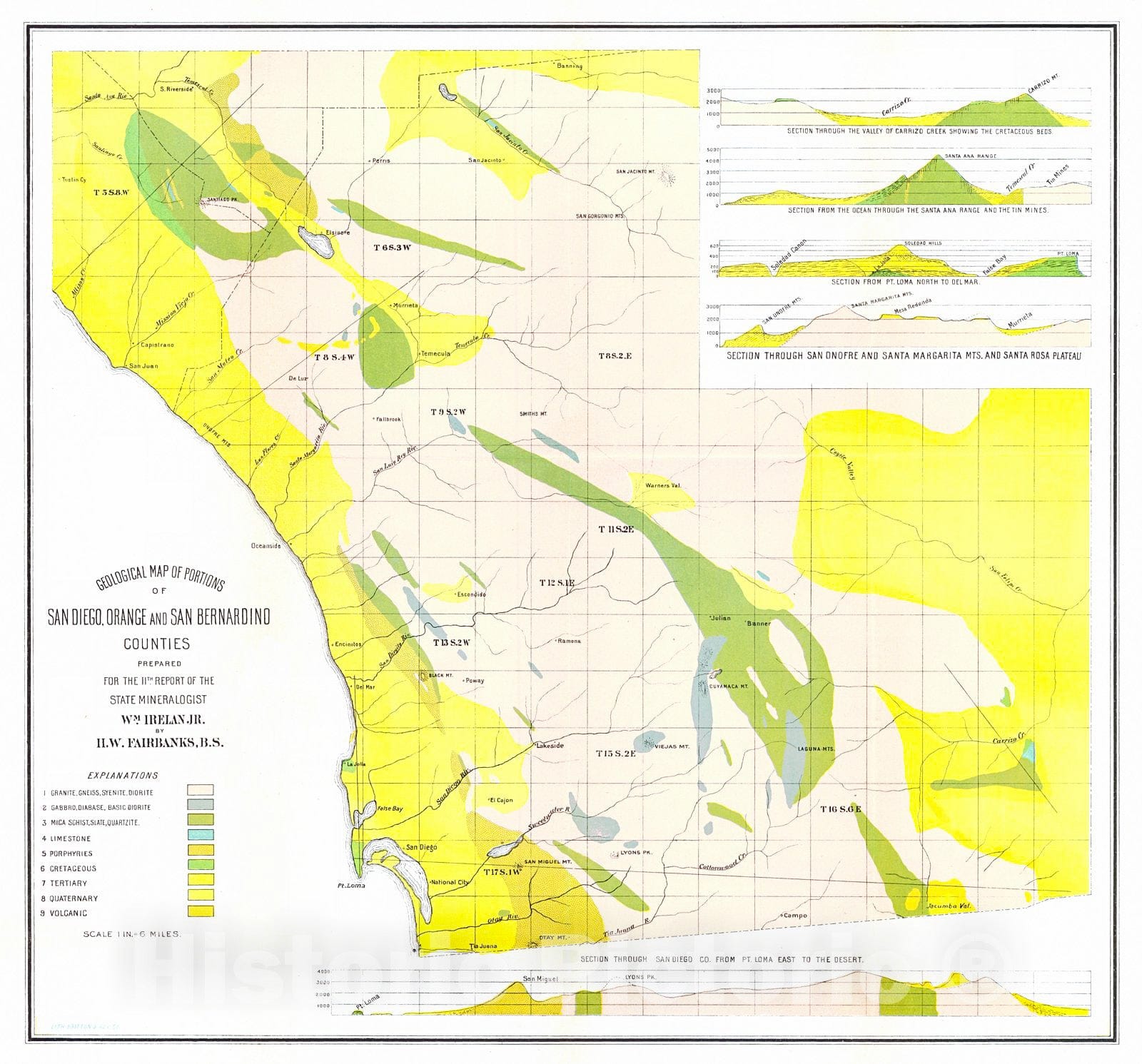 Historic Map : 1891 Geological Map of Portions of San Diego, Orange, and San Bernardino Counties : Vintage Wall Art