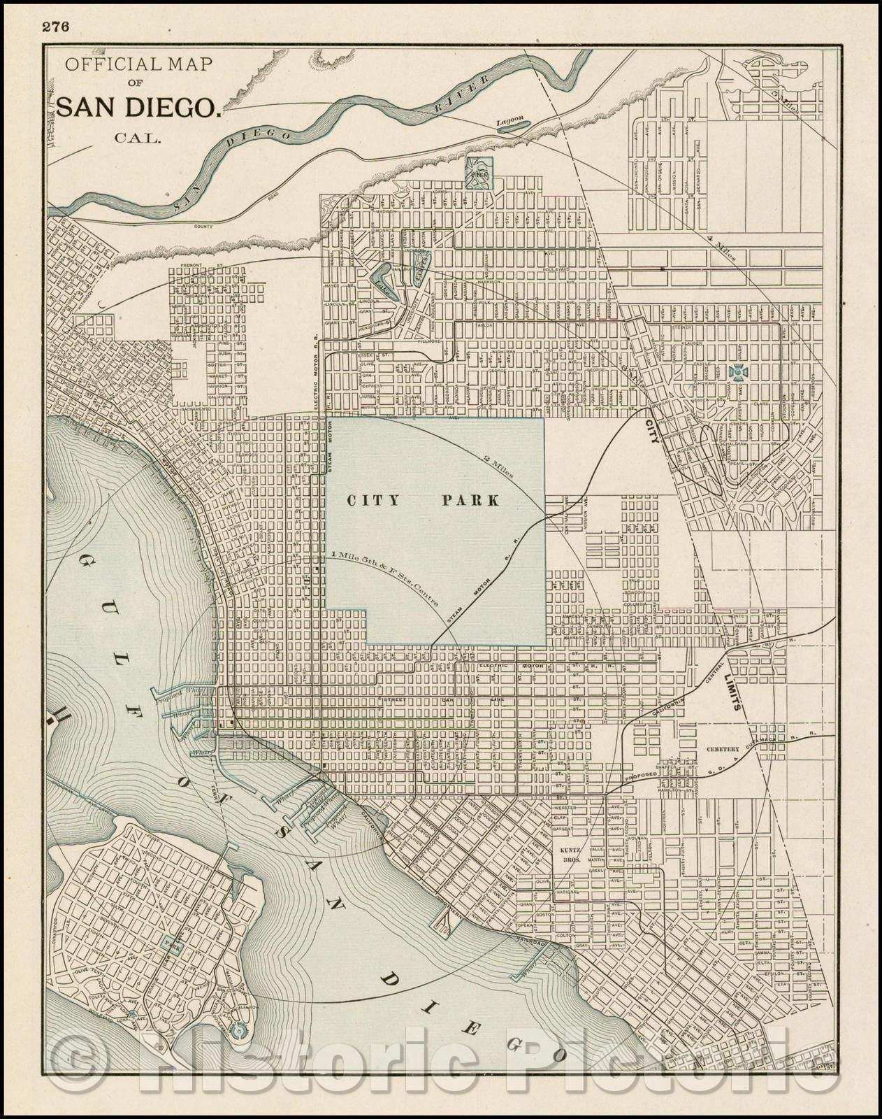 Historic Map - Official Map of San Diego. Cal, 1899, George F. Cram - Vintage Wall Art