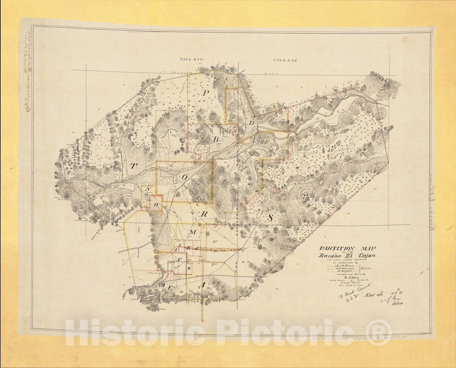• .Historic Map : Partition Map of Rancho El Cajon San Diego County, Caifornia, 1874, M. G. Wheeler, Vintage Wall Art