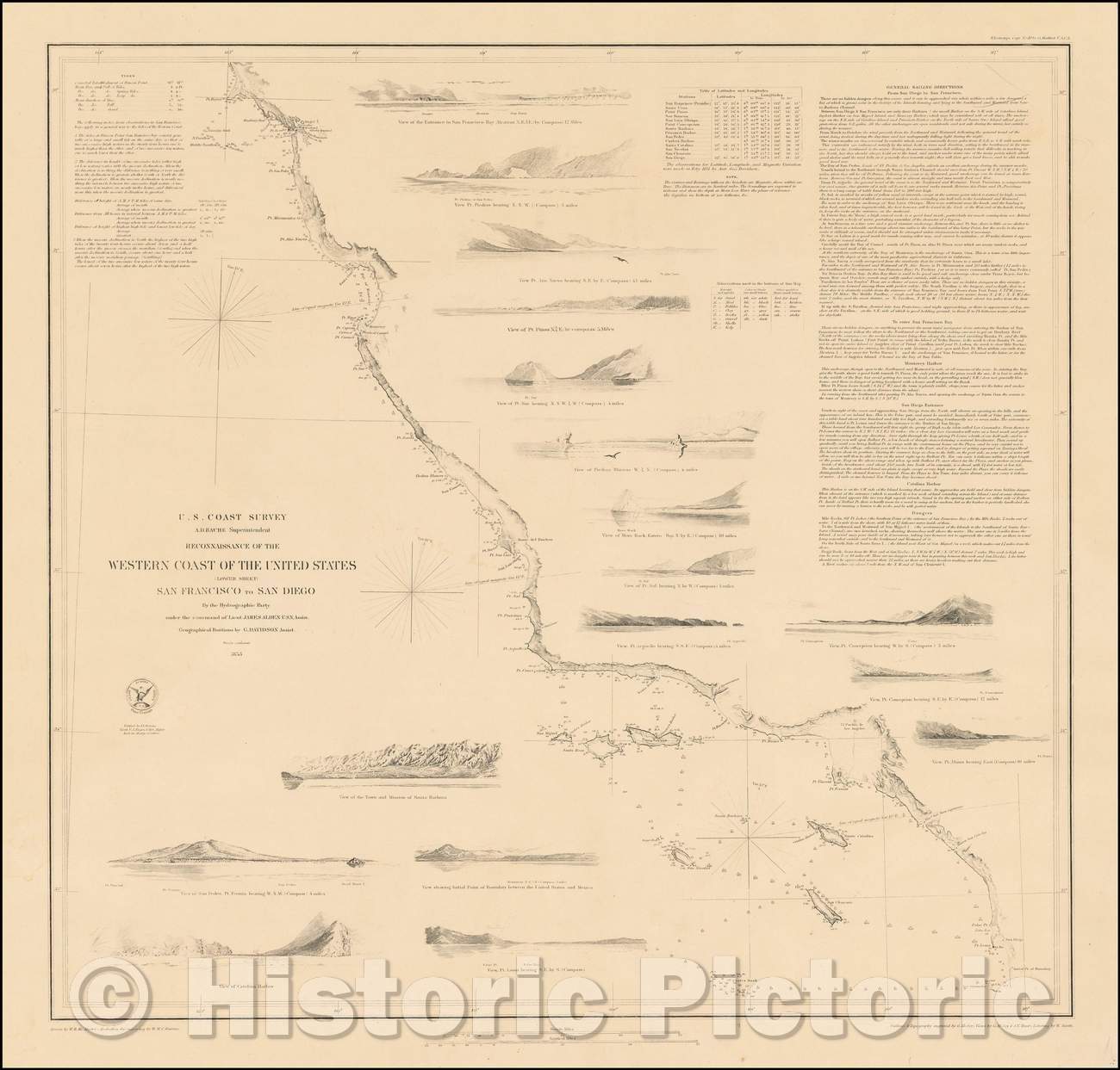 Historic Map - Reconnaissance of the Western Coast of the United States From San Francisco to San Diego, 1853, United States Coast Survey - Vintage Wall Art