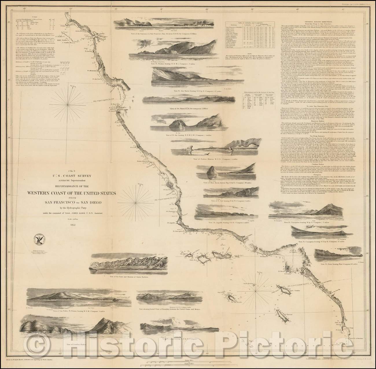 • .Historic Map - Reconnaissance of the Western Coast of the United States From San Francisco to San Diego, 1852, United States Coast Survey - Vintage Wall Art
