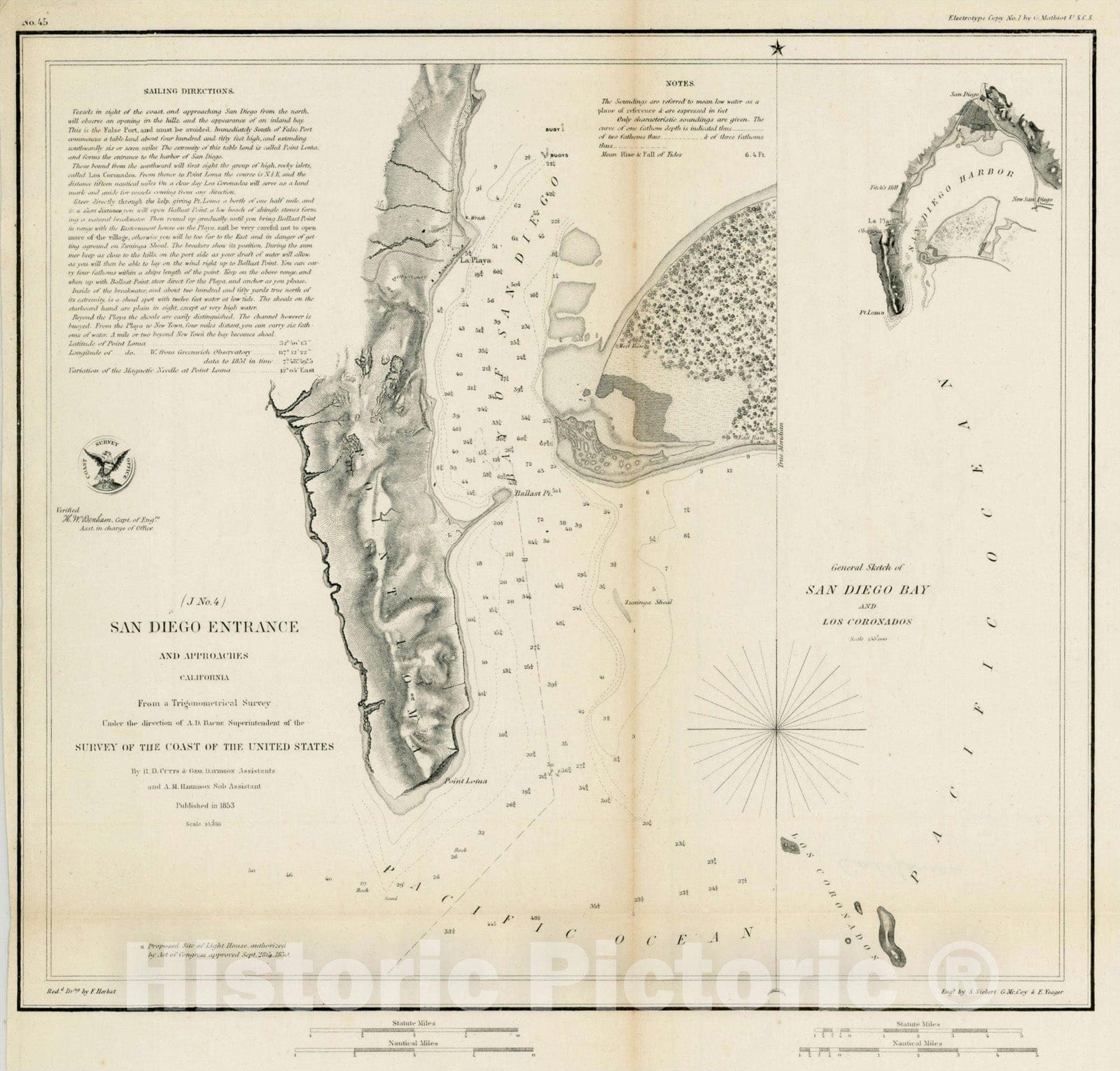 Historic Map : San Diego Entrance and Approaches, 1853, 1853, U.S. Coast Survey, v1, Vintage Wall Art