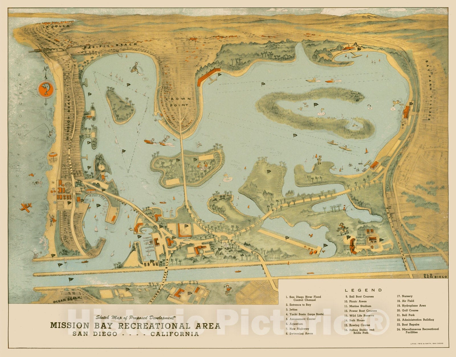 • .Historic Map - Sketch Map of the Proposed Development Mission Bay Recreational Area San Diego - - - - California, 1945, Frye & Smith - Vintage Wall Art