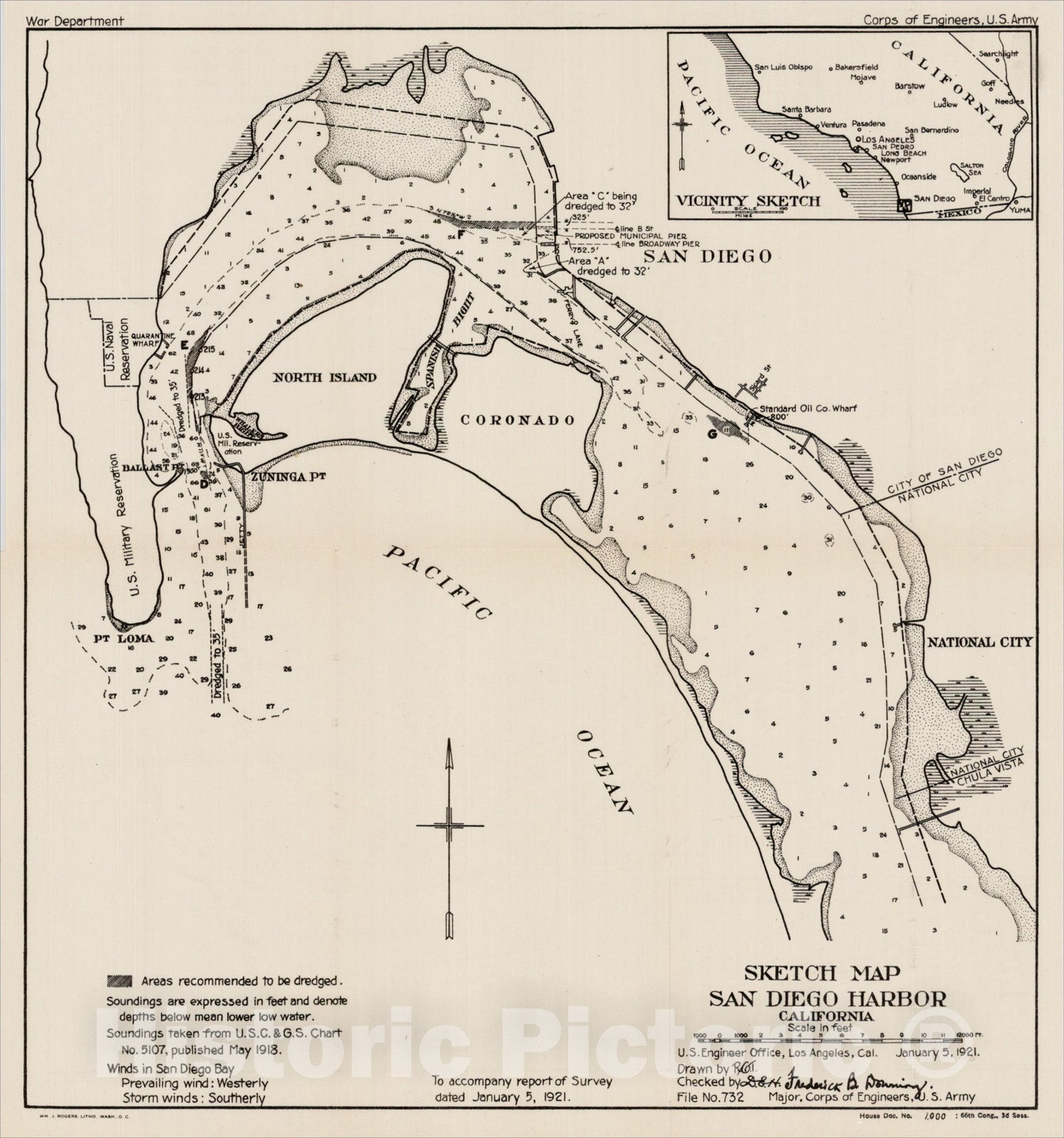 Historic Map : Sketch Map of San Diego Harbor, California, 1921, 1921, U.S. Army Corps of Engineers, Vintage Wall Art