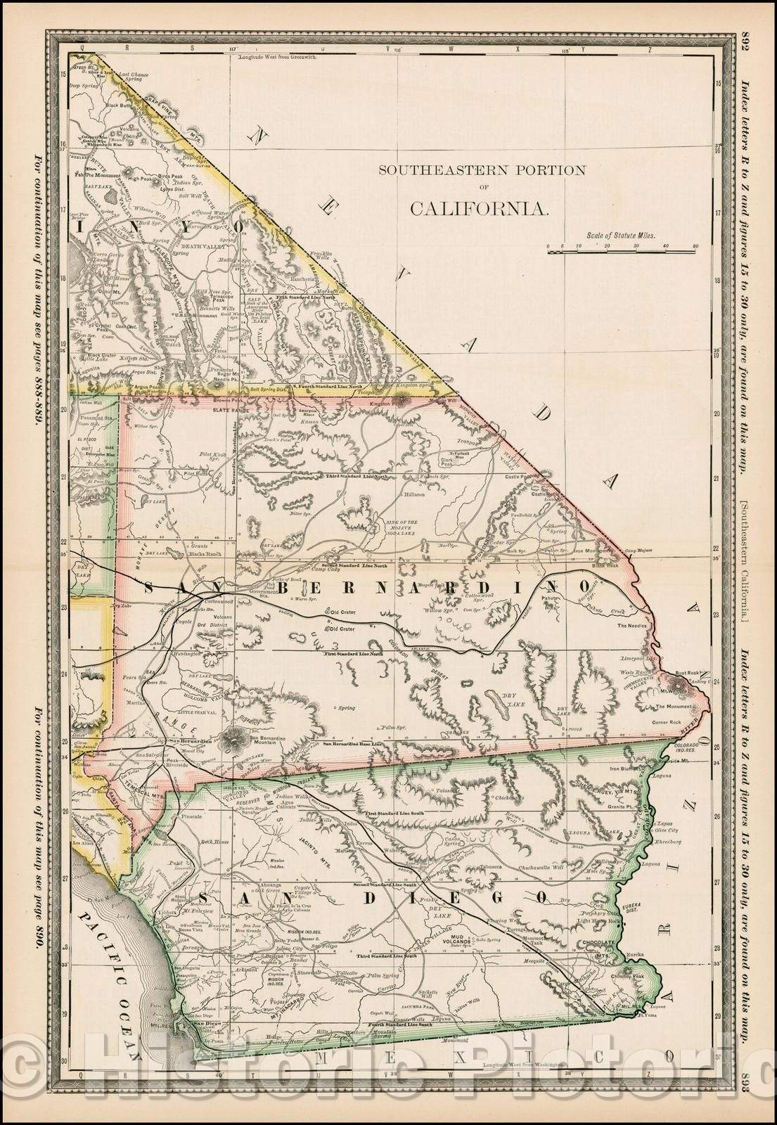 • .Historic Map - Southeastern Portion of California [San Diego, San Bernardino and Inyo Counties], 1884, Rand McNally & Company - Vintage Wall Art
