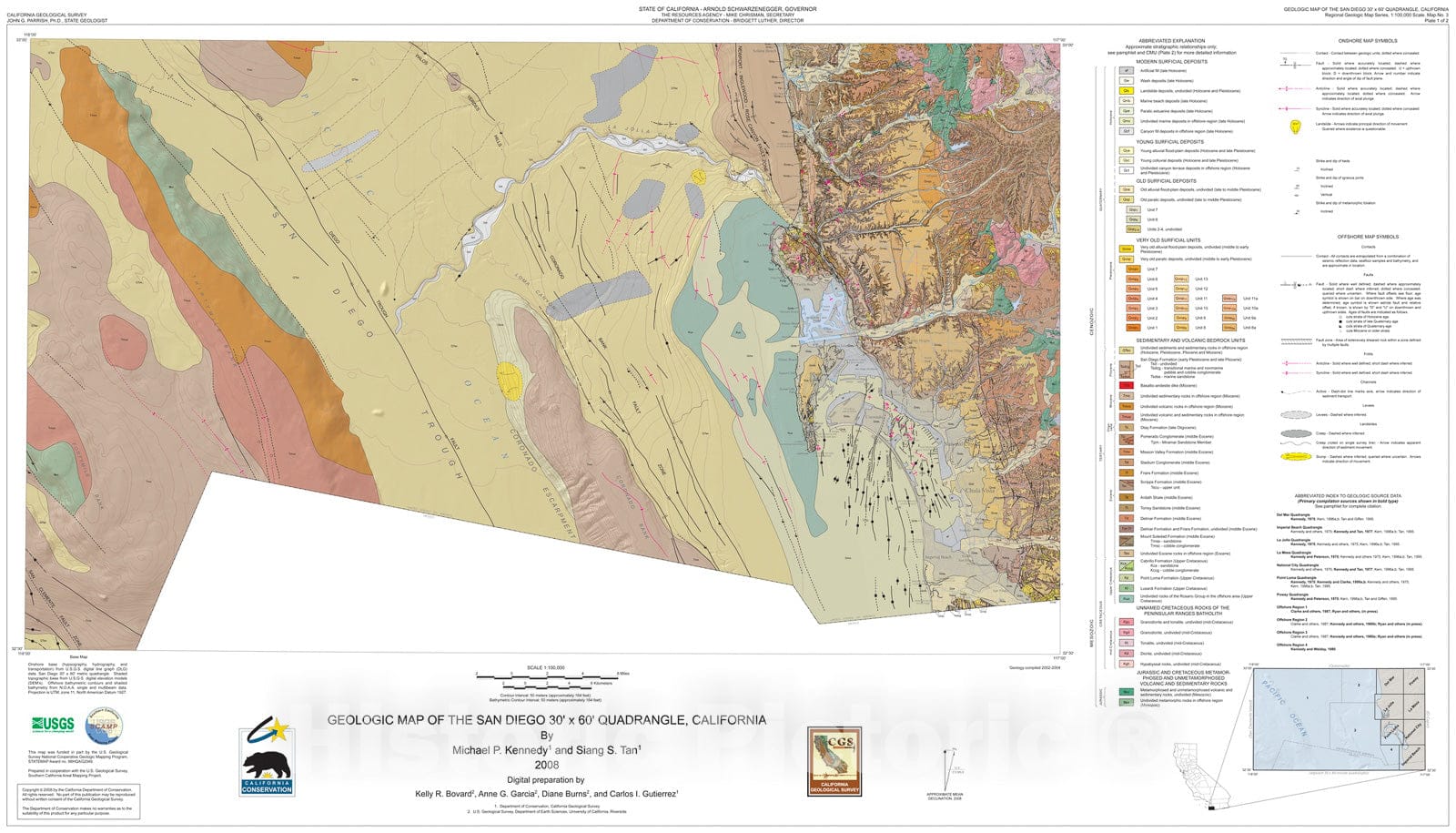 Map : Geologic map of the San Diego 30' x 60' quadrangle, California, 2008 Cartography Wall Art :